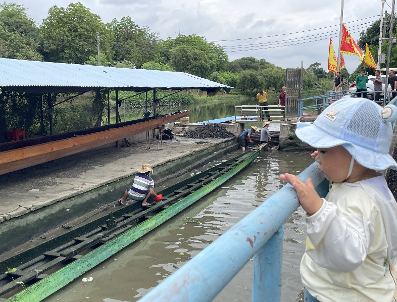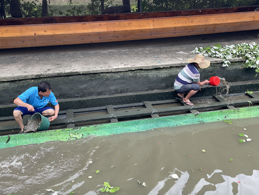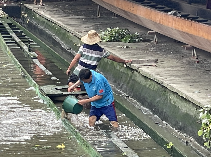 随后,村民来到船上,用水桶、勺子将船内的积水尽数舀出。与此同时,两三名村民将龙船坞出入口的甲板拉起,用铁铲将封堵的泥沙铲到一边。随着河涌的水开始涌入龙船坞,慢慢上涨的水面将龙船重新支撑起来,待水位上涨到一定程度后,两名村民分别负责船的一头一尾,慢慢将龙船从龙船坞缓缓拖出,再固定到龙舟基地的人造码头上,整个起龙步骤就基本完成了。