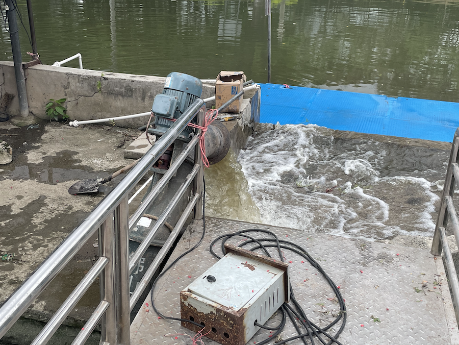 现场,两名村民启动放置于龙船坞的抽水泵,随着机器发出轰鸣声,龙船坞内的河水也被相继抽出,藏在当中的龙船也逐渐从河底显露出来。