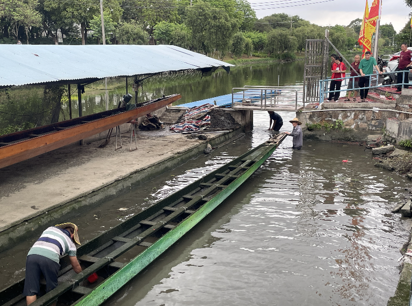 村民一前一后将龙船从龙船坞拖出河涌