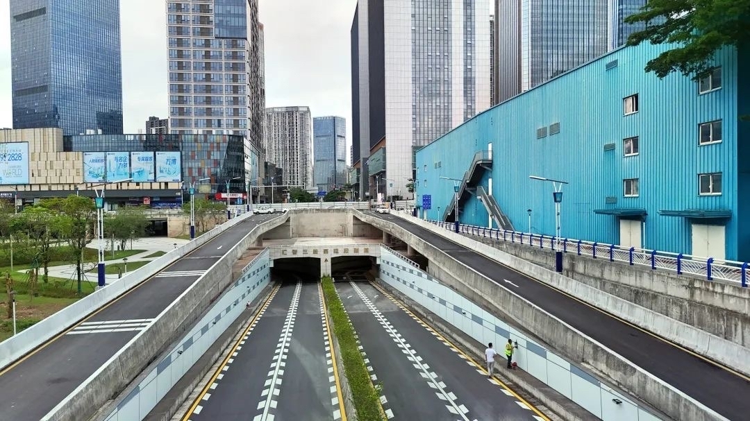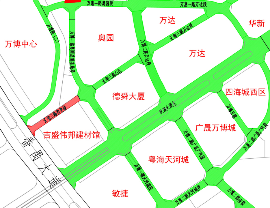 目前,汇智三路西延段通过双向四车道接入总长2.3公里万博地下主环路,可快速直达德舜大厦奥园国际中心、万达广场四海城、广晟万博城、天河城等核心区商业综合体,形成高效便捷的“5分钟商务通勤圈”。