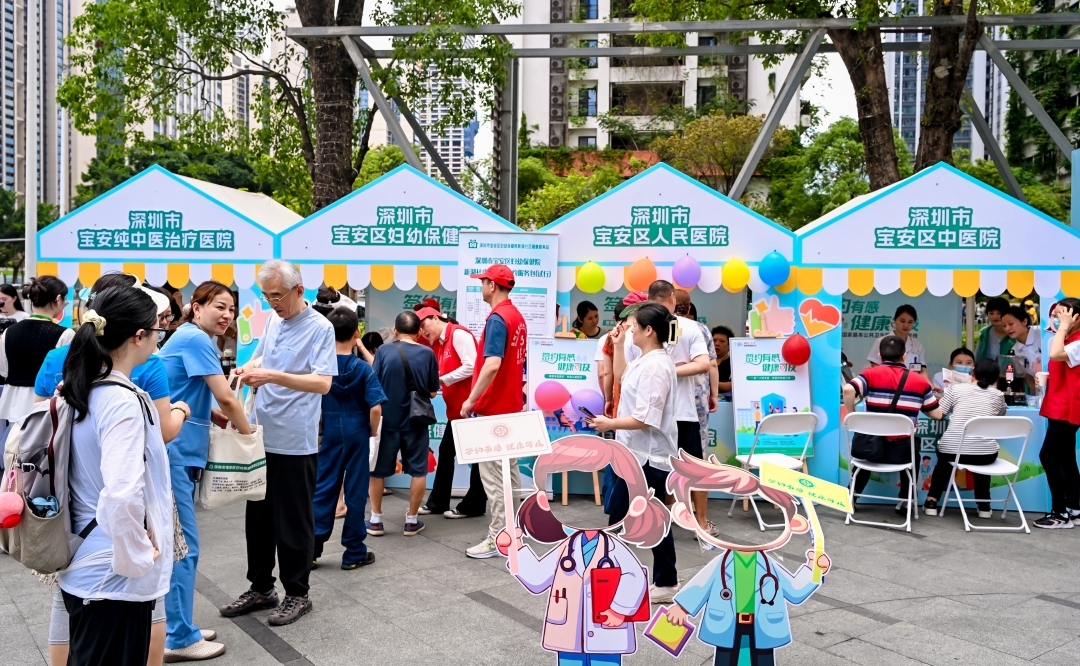活动当天,宝安壹方城广场热闹非凡,健康市集区、学习互动区、智能设备体验区和直播间吸引了不少市民打卡。来自宝安区人民医院、宝安区中医院、宝安区妇幼保健院、深圳市纯中医治疗医院、宝安区慢性病防治院的医护团队,为市民提供名医义诊、体重管理、八段锦、中医药文化知识互动、急救培训等具有宝安特色的健康服务。“救”在身边、“绳”采飞扬、“锦”上添花、“趣”识百草等丰富多彩的互动游戏,将家庭医生签约服务、慢性病管理等基本公共卫生服务内容纳入游戏化场景中,让市民在互动中进一步了解国家基本公共卫生服务项目。
