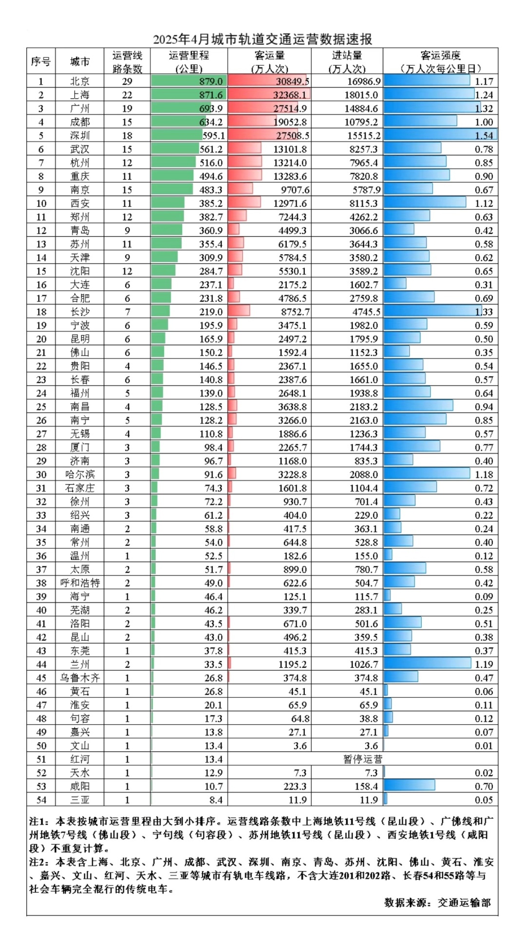 目前,除去广佛线、广州地铁7号线西延顺德段,佛山地铁独立运营的轨道线是佛山地铁2号线和佛山地铁3号线,以及南海有轨电车1号线。交通运输部《2025年4月城市轨道交通运营数据速报》显示,佛山城市轨道交通目前的总运营里程为150.2公里(含广佛线及广州地铁7号线西延顺德段),位居全国第21位,今年4月的总客运量为1592.4万人次,平均单日客运量为53万人次。