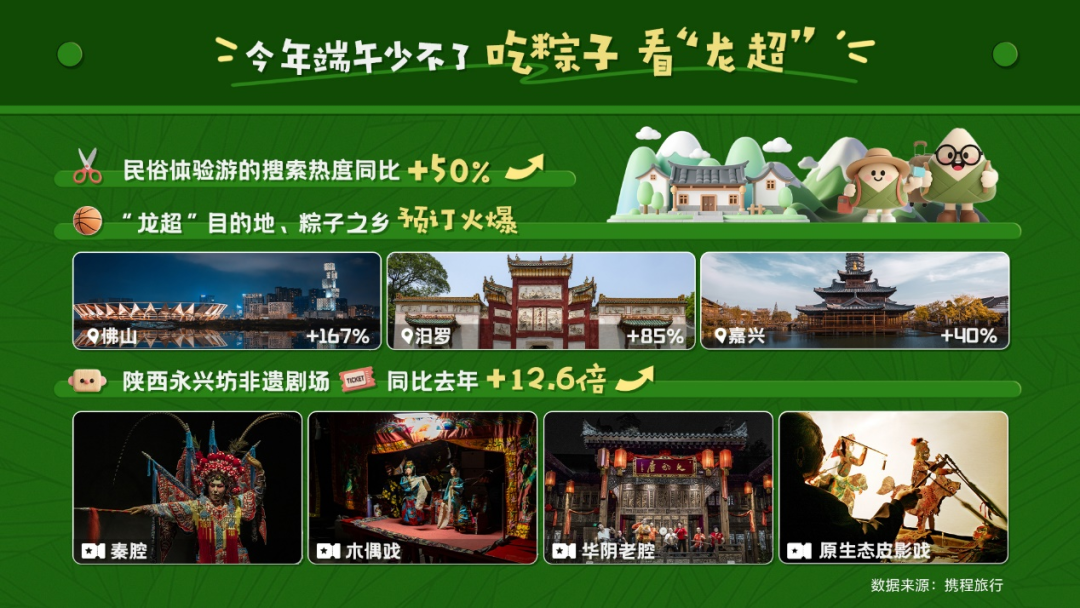 端午作为传统节日,民俗体验游依旧是今年的不二之选。携程数据显示,与去年相比,端午民俗体验游的搜索热度同比增长50%。游客热衷于参与各地的赛龙舟、包粽子、佩香囊等传统活动,感受浓厚的节日氛围。