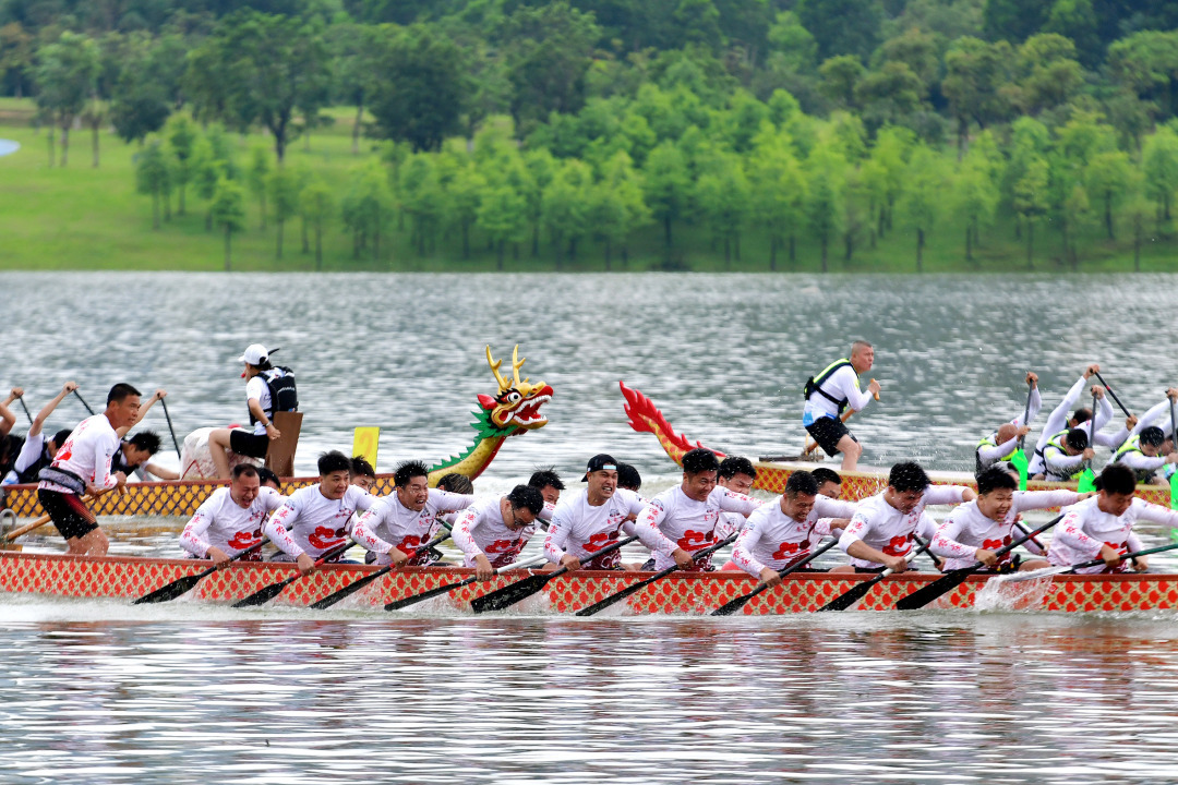 本届赛事分为村社男子组、村社女子组以及企事业公开混合组,27支龙舟队伍在九龙湖展开一场激烈的水上竞逐。