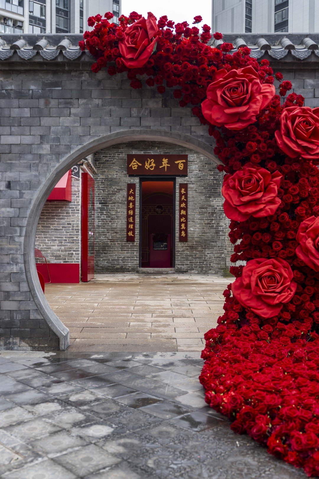 步入其中,青砖黛瓦间古韵流淌,浪漫元素处处可见。巨型玫瑰瀑布墙倾泻而下,镜面打卡区光影交错,“沾沾喜气”互动区趣味横生。周边环境碧波倒影、飞檐翘角、历史建筑成群,鲜花连廊开满鲜艳三角梅,百年古榕树静候新人到来。
