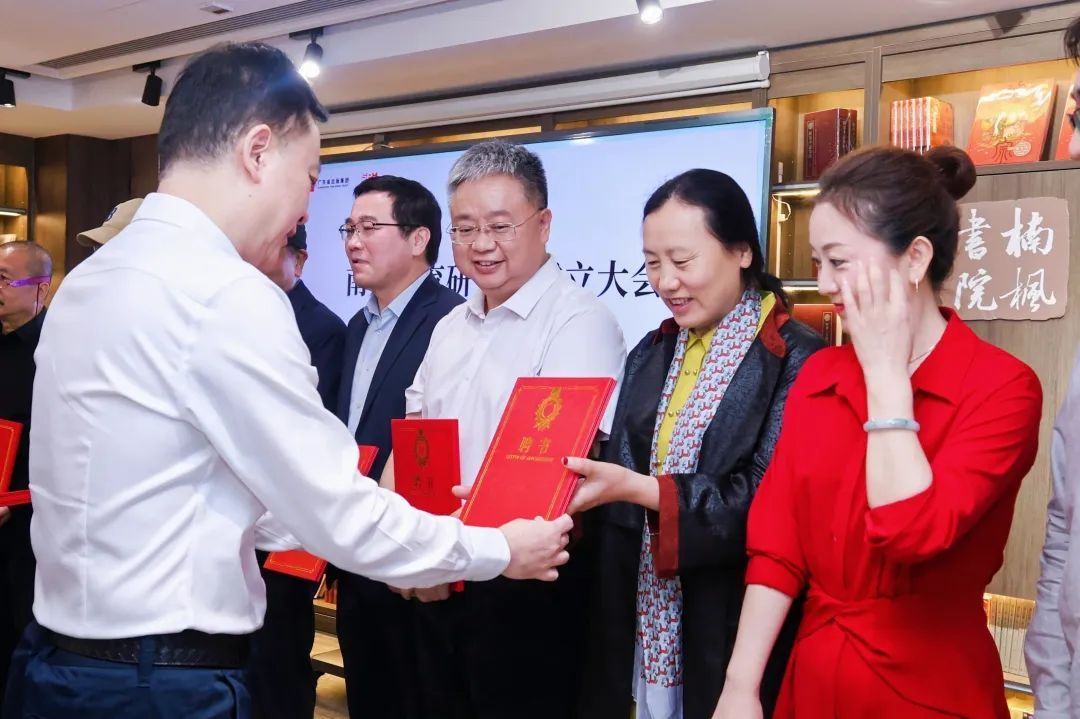 随后举行了南方美育研究院揭牌仪式,谭君铁董事长、叶河总经理分别向研究院受聘人员颁发聘书。