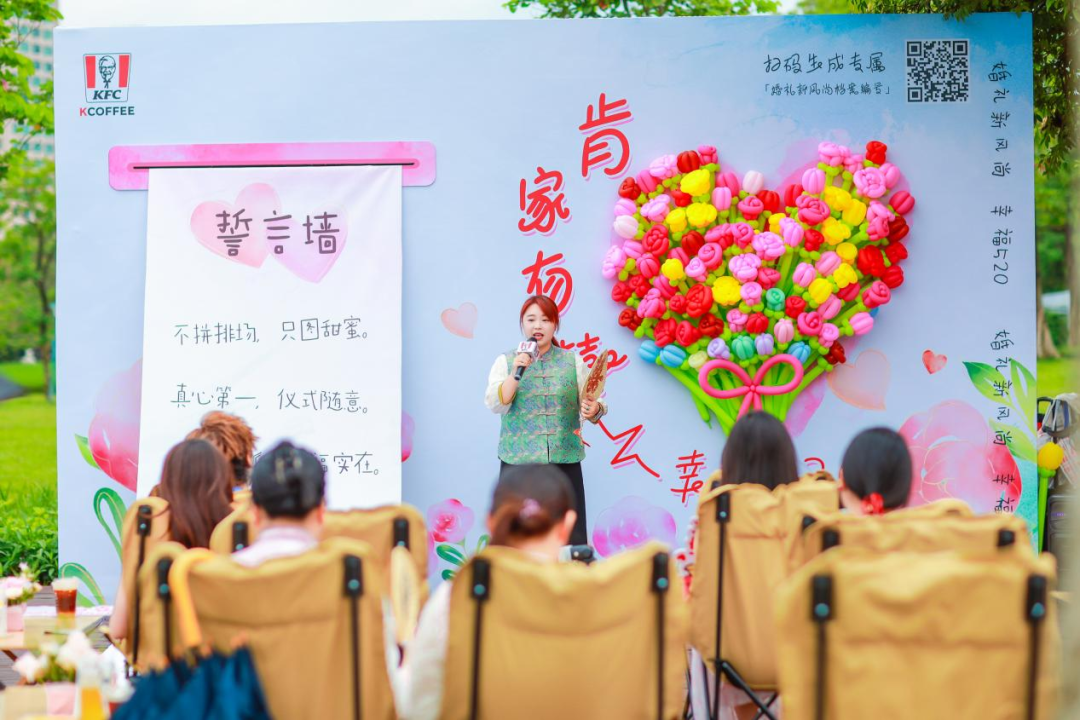在宏城公园的“婚俗新风尚”沙龙中,非遗大妗姐为情侣们带来了一场生动的分享课。她介绍了广府传统婚礼习俗的现代演绎,展示了如何将传统礼仪与现代生活相结合。例如,用电子邀请函代替纸质文书,既环保又便捷;用日常的甜蜜仪式替代繁琐的传统礼仪,让婚礼更加贴近生活。这些创新形式不仅保留了传统文化的精髓,还赋予了其新的时代内涵。活动还设置了“幸福誓言长廊”和“草坪秘境”等互动环节,情侣们在玫瑰花墙上写下对婚姻的期待与承诺,形成了一面“会说话的誓言墙”。