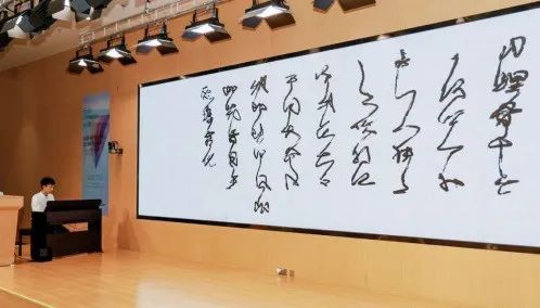 演奏者钟卓熹在台上进行钢琴表演的同时,屏幕呈现出一幅充满节奏和情绪的书法作品。随后,便有观众上台体验,在观众的一曲《彩云追月》演奏后,笔墨如微风徐动,在书卷上留下行云流水的轨迹。