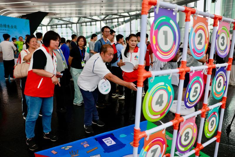 “得分!”在广州市生活垃圾分类宣传周启动仪式上,市民群众在垃圾分类绿色全运趣味运动会的点位前提前体验十五运会与绿色环保相结合的魅力。绿茵分投战、乒乓速分台、箭指分类环等分类趣味运动项目获得市民朋友的点赞。