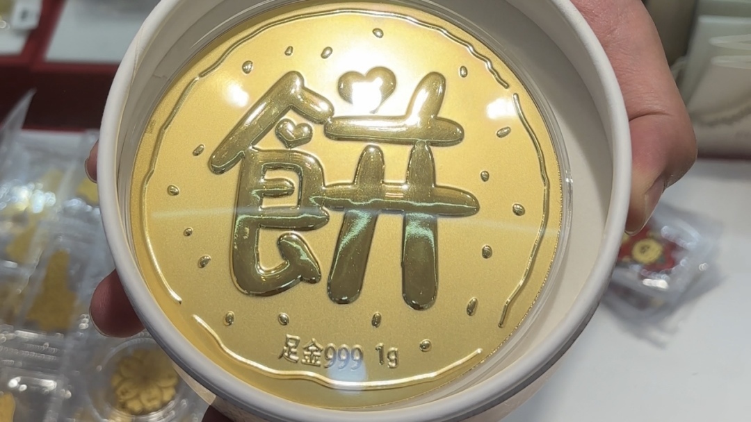 记者看到,黄金大饼有一小个巴掌大,还有如“公主请发财”“生日快乐”等圆形金饰。陈先生介绍,黄金是硬通货,可以当作是一种礼物,小克重的创意型产品在注重仪式感的年轻情侣颇受欢迎。