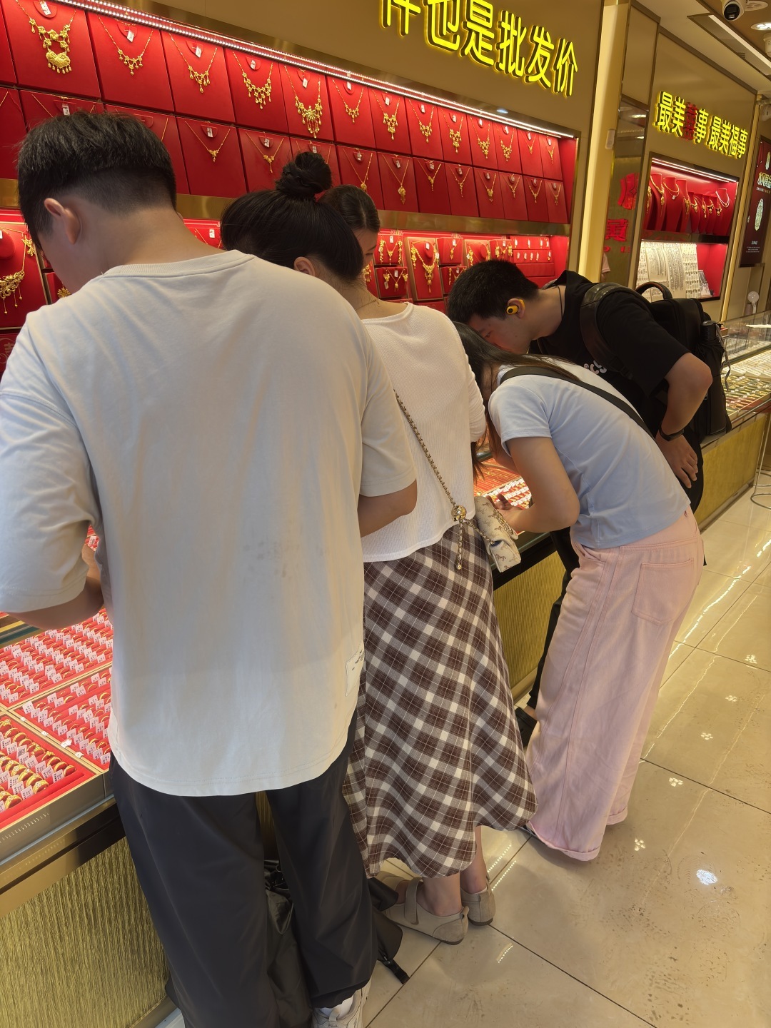 5月20日上午10点,广州长寿路的老牌金店内,柔和的灯光将玻璃柜台里的金饰映得熠熠生辉。已有两对年轻情侣在柜台前低声交谈,女生试戴着戒指,指尖的金光与笑容一样闪亮,不到半小时,年前情侣便买了一对黄金戒指离开。另一位前来购买的男顾客说,陪女友到附近金店看看,有合适的款式便买下。