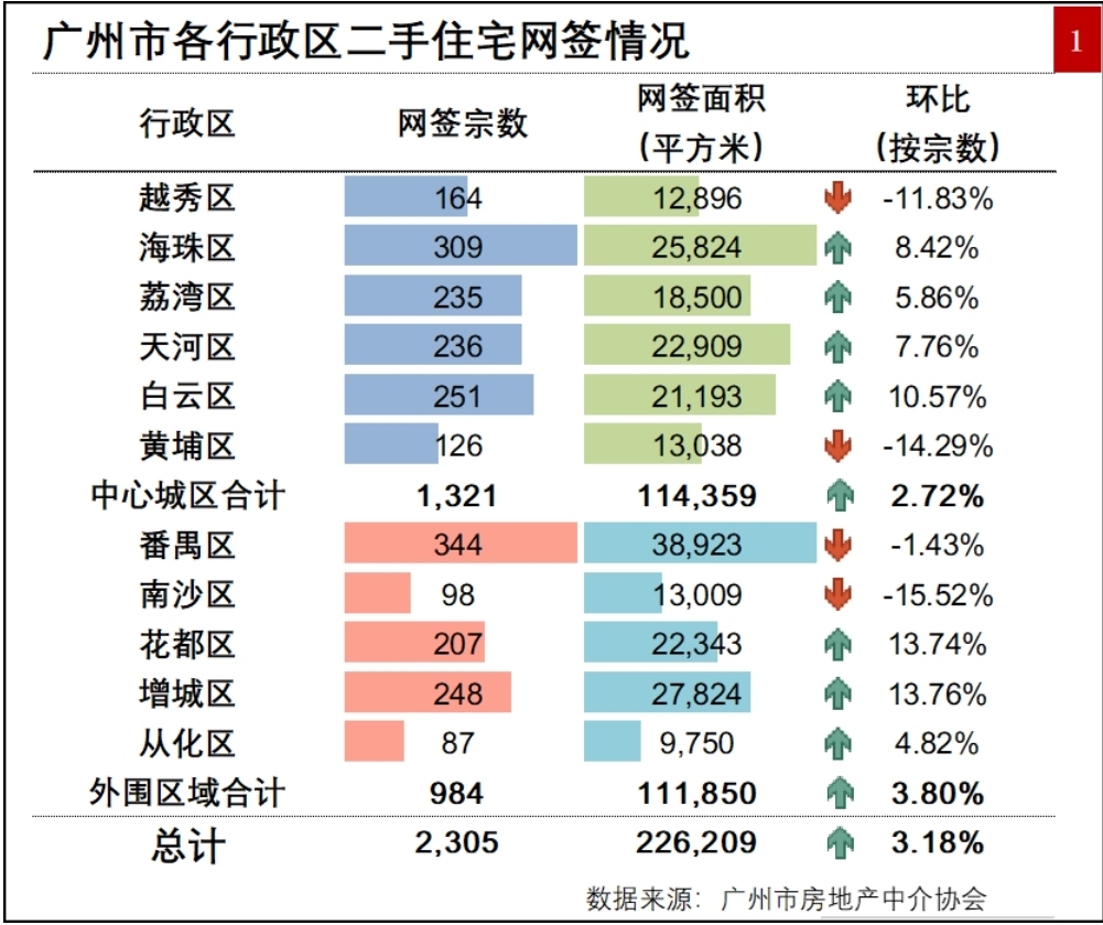 分区域看,大多数行政区环比上涨,其中增城区、花都区和白云区均取得两位数增长,增幅分别是13.76%、13.74%和10.57%;海珠区、天河区、荔湾区和从化区分别增长8.42%、7.76%、5.86%和4.82%;南沙区、黄埔区、越秀区和番禺区环比有下降,降幅分别为15.52%、14.29%、11.83%和1.43%。