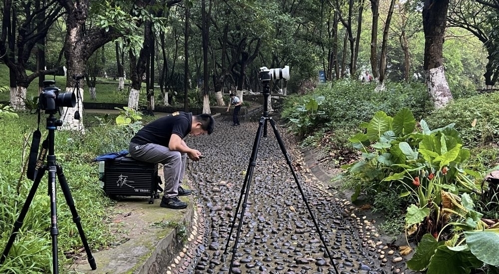 据了解,萤火虫偏爱温暖、潮湿且多水的栖息之所,像杂草丛生之地、潺潺沟河边以及繁茂树林都是它们钟爱的家园。此次,大家将拍摄地点选定在大夫山的聚秀园。当抵达聚秀园时,发现各种专业摄影器材早已严阵以待,摄影爱好者们早早抢占了有利位置,精心挑选出最佳拍摄角度,仔细调整好相机的各项参数,一切准备就绪,只等那神秘的小精灵登场。记者也赶忙在溪涧旁寻得一处草丛开阔的地方,准备捕捉那些美妙瞬间。