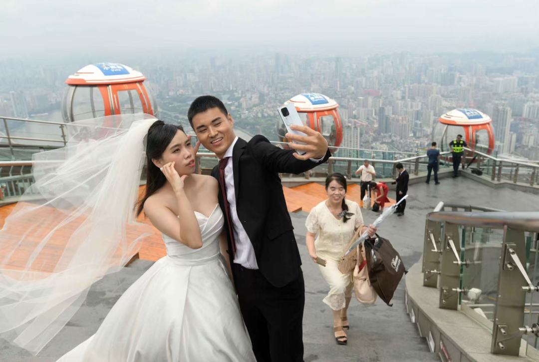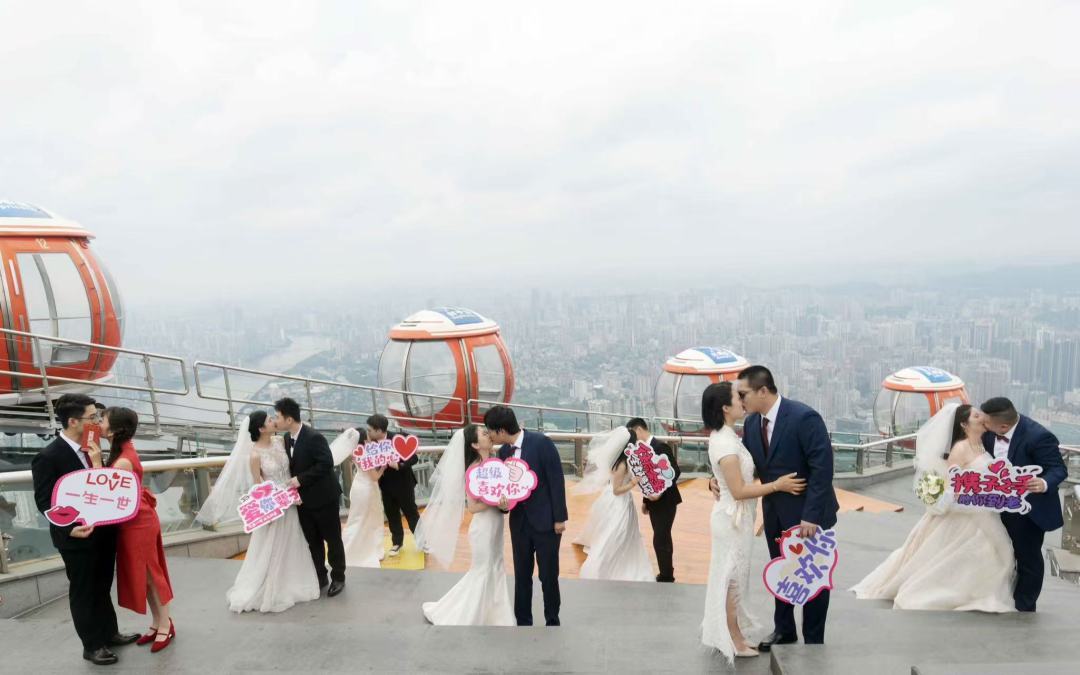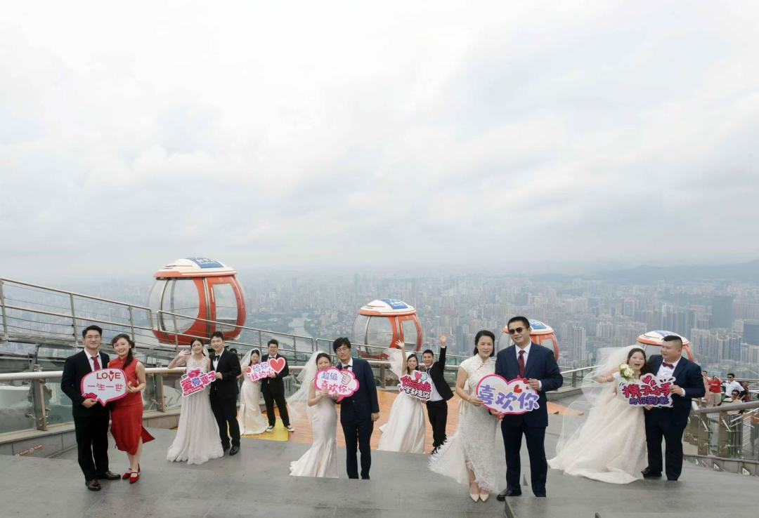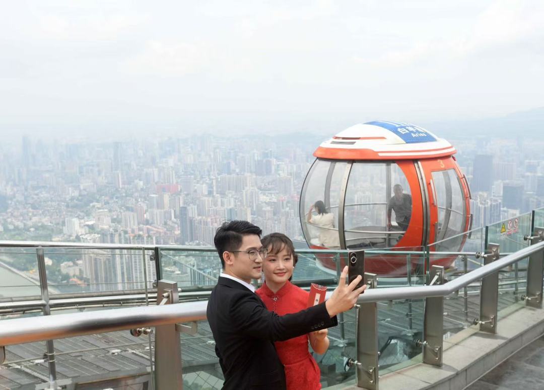 上午10时,新人身着精致婚服携手登上全国最高的广州塔婚姻登记户外颁证点。行却扇礼时的眉眼含羞,集体宣誓的誓言铿锵有力,共饮合卺酒的甜蜜瞬间,将传统婚俗的庄重典雅与现代仪式的浪漫时尚,在600米高空实现了完美碰撞。