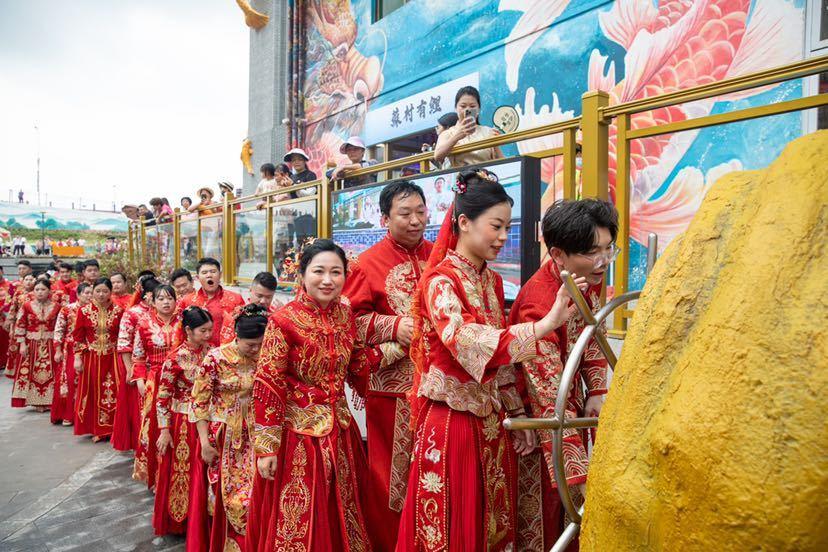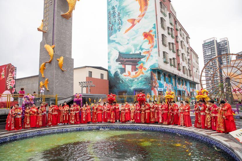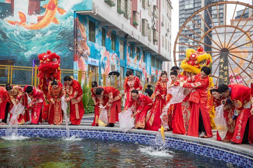 当日上午,伴随着悠扬的古乐,身着锦绣红袍的新郎官,挽着凤冠霞帔、头顶红盖头的新娘缓缓踏上红毯。在亲友和现场嘉宾的见证与祝福中,来自各个领域的20对新人依次行锦鲤妆霞、鲤书传情、鲤跃镜缘、金狮献鲤等仪式,体验中国传统婚嫁风俗。