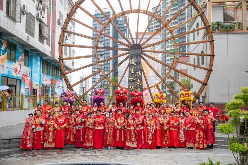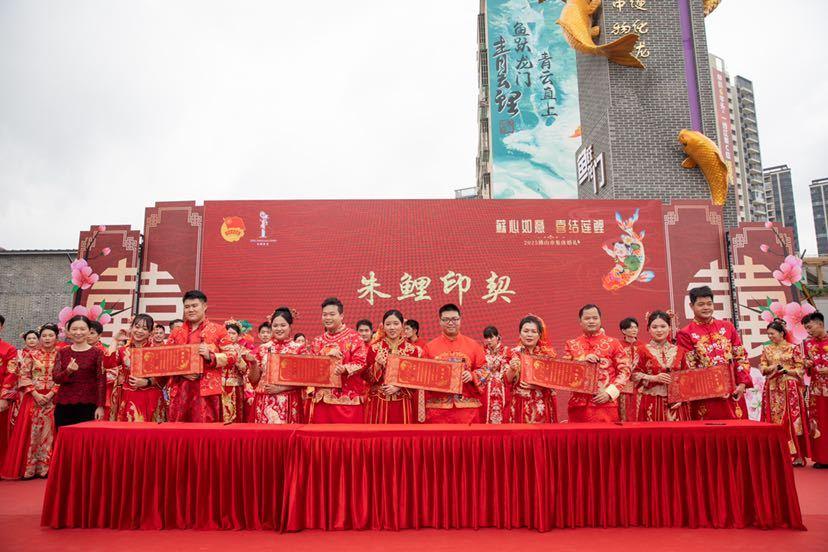 5月20日,以“蘇心如意 喜结莲鲤”为主题的佛山市青年集体婚礼在高明区苏村锦鲤文化街区浪漫启幕。20对新人身着特色古风婚服,以中式婚礼喜结连理。