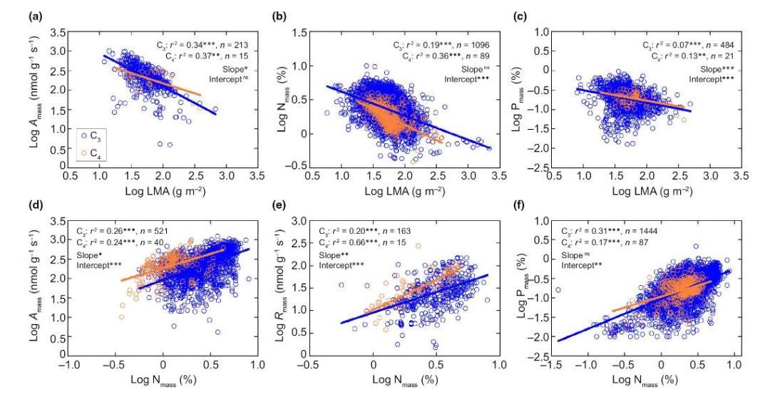 中国科学院华南植物园联合多位国际知名的植物生理学和生态学专家,首先系统综述了C4植物的光合作用机制和高效的水分养分利用效率。再次,基于前期同质园的实验数据,详细对比了C4和C3植物叶片功能性状及其相关关系的差异,并利用全球植物功能性状数据库TRY,构建了包含89种C4草本植物和1444种C3草本植物的叶片经济学谱数据集,通过数据集的深入分析,阐明了C4植物的资源权衡策略及其生态适应性。最后,对C4植物在未来气候变化背景下的响应和适应潜力以及对全球变化模型的贡献进行了展望。