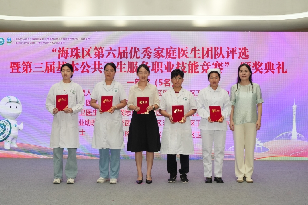 在颁奖环节,“海珠区第六届优秀家庭医生团队评选暨第三届基本公共卫生服务职业技能竞赛”多个奖项揭晓。龙凤街、瑞宝街社区卫生服务中心等团队荣获“优秀家庭医生团队奖”“优秀基本公卫服务团队奖”;谭文琦、刘咏雪等医护人员分获“星级家庭医生”“优秀家庭医生助理”等称号。