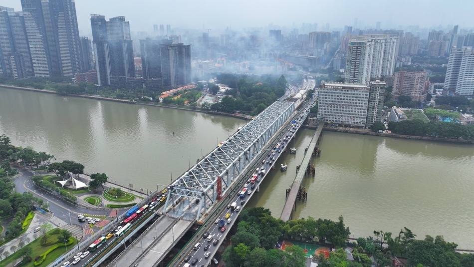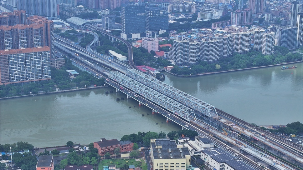 桥梁通过优化设计,采用分幅新建、活化利用等方案,“双桥烟雨”景观得以原貌保留,不仅缩减一年工期,还避免了内环路拆除迁建的交通安全风险,真正实现了历史建筑保护与铁路枢纽建设双赢的局面,让新桥与旧貌在珠江之上和谐共生。