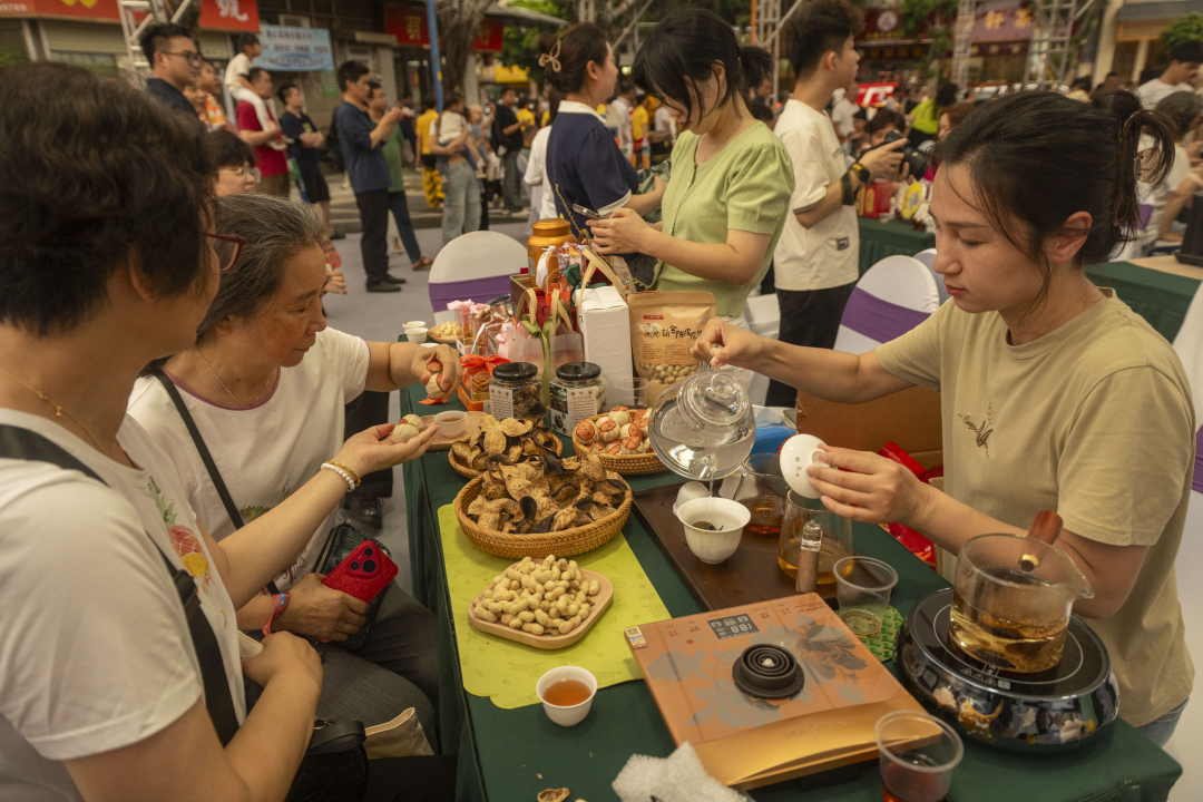 50多家参展商齐聚2000平方米的茶香街区,带来绿茶、红茶、乌龙茶等6大茶类,争奇斗艳。名茶展区、传统茶艺、非遗展演与70余个广府美食摊位相互映衬,共同勾勒出广府夜生活的鲜活图景。