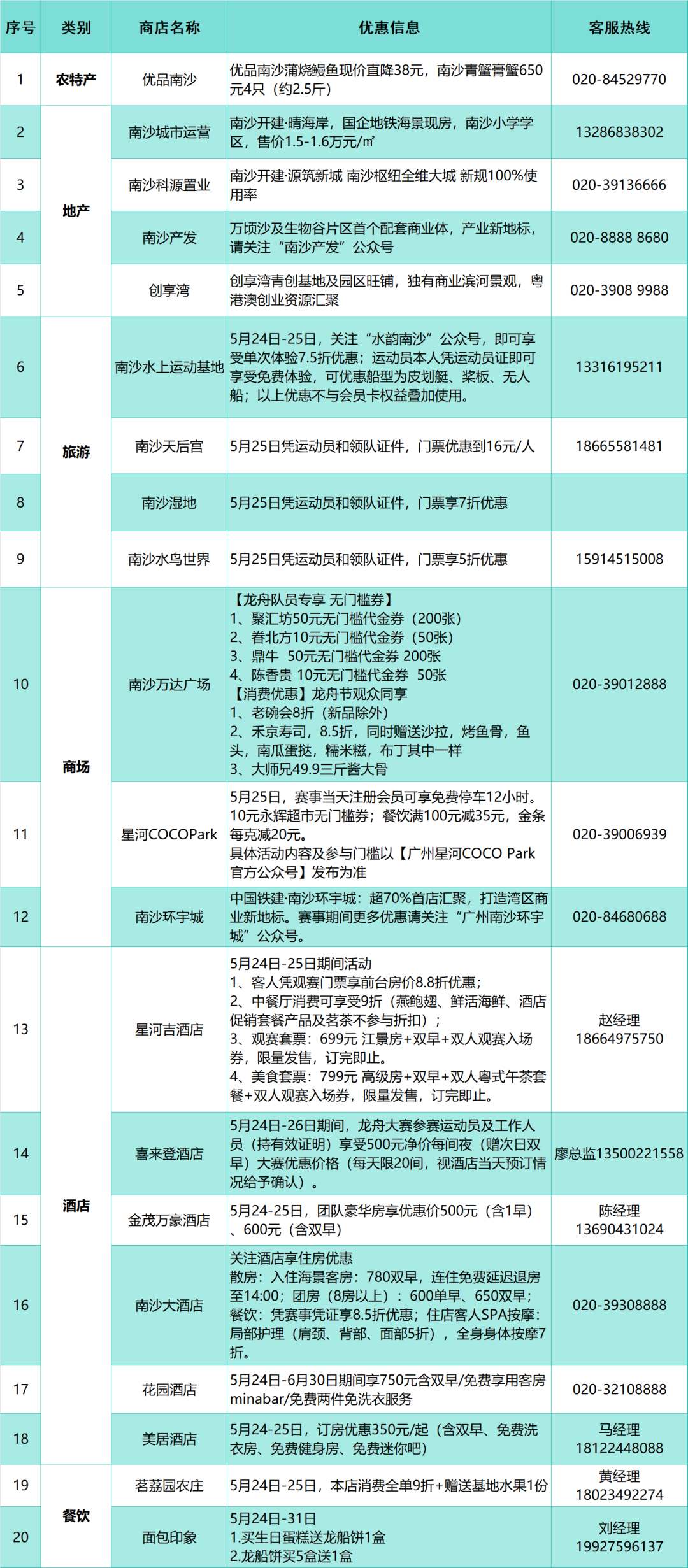 百店联动优惠:优品南沙、南沙开建集团、南沙万达广场、星河COCO park、南沙环宇城、星河吉酒店、喜来登酒店、金茂万豪酒店、南沙大酒店、南沙花园酒店、美居酒店、南沙水上运动基地、茗荔园等100+商户推出“2025南沙龙舟大赛限定套餐”,涵盖餐饮、住宿、购物、文旅等领域,打造“一图在手,畅享南沙”的便捷体验(具体优惠信息请详询客服热线)。