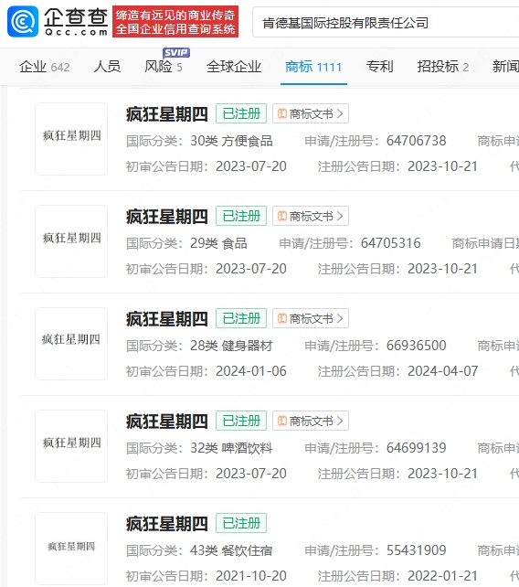 2022年,肯德基成功在餐饮住宿类(第43类)注册“疯狂星期四”商标,但其他类别如方便食品、广告销售等因被第三方抢注而受阻。