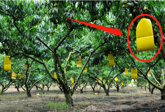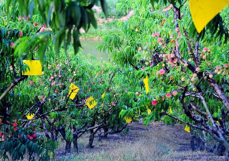 ▲每棵桃树上的黄色纸板为生物防虫板,减少农药用量,安全健康