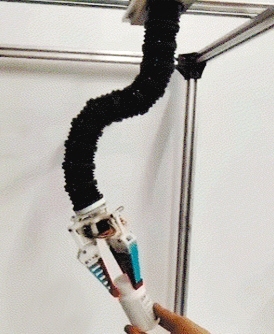 钟勇介绍,相比工业机器人的刚性机械臂,象鼻机械臂更加灵活和柔性,可以接触更加柔软的、易形变的物体,而不用担心损坏。