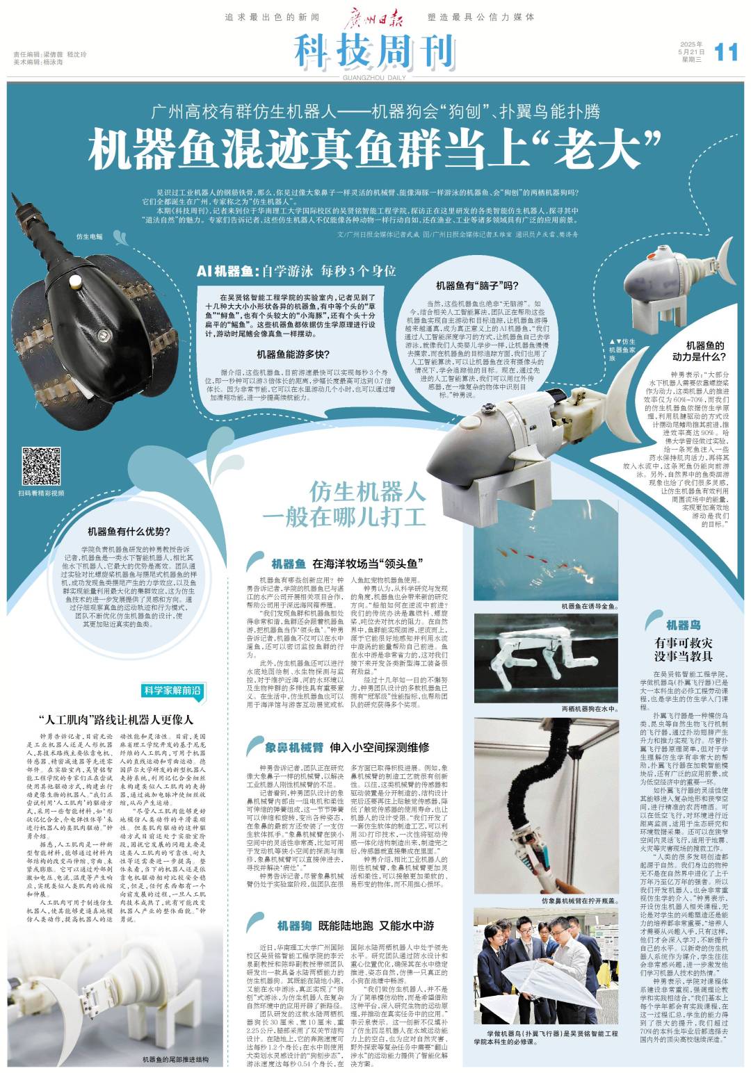 见识过工业机器人的钢筋铁骨,那么,你见过像大象鼻子一样灵活的机械臂、能像海豚一样游泳的机器鱼、会“狗刨”的两栖机器狗吗?它们全都诞生在广州,专家称之为“仿生机器人”。
