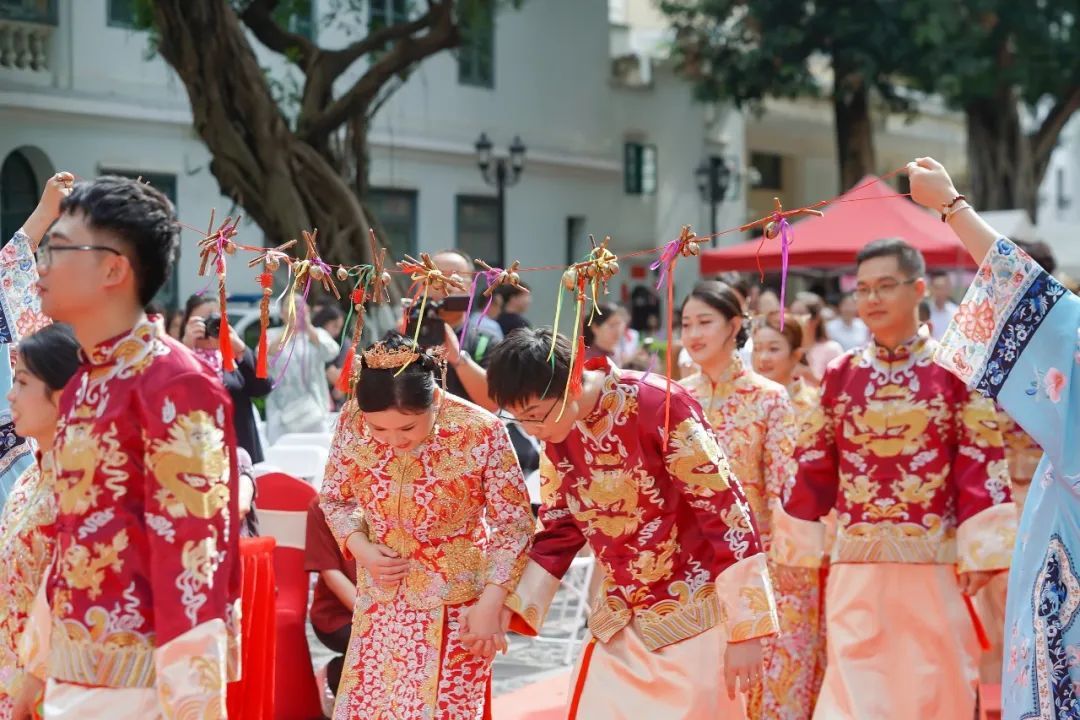 当中式传统遇上西式浪漫,每一帧都是人间美好。从沙面胜利宾馆出发,身着中式礼服的20对新人乘坐定制的观光花车进行环岛巡游,浪漫演绎中式浪漫与西式风情的美学交融。在花车巡游途中,新人们在导览的陪伴下见证沙面的历史变迁,用心探寻和感受着沙面厚重的历史文化底蕴,沉浸式体验兼具传统与时尚特色魅力的集体婚礼。