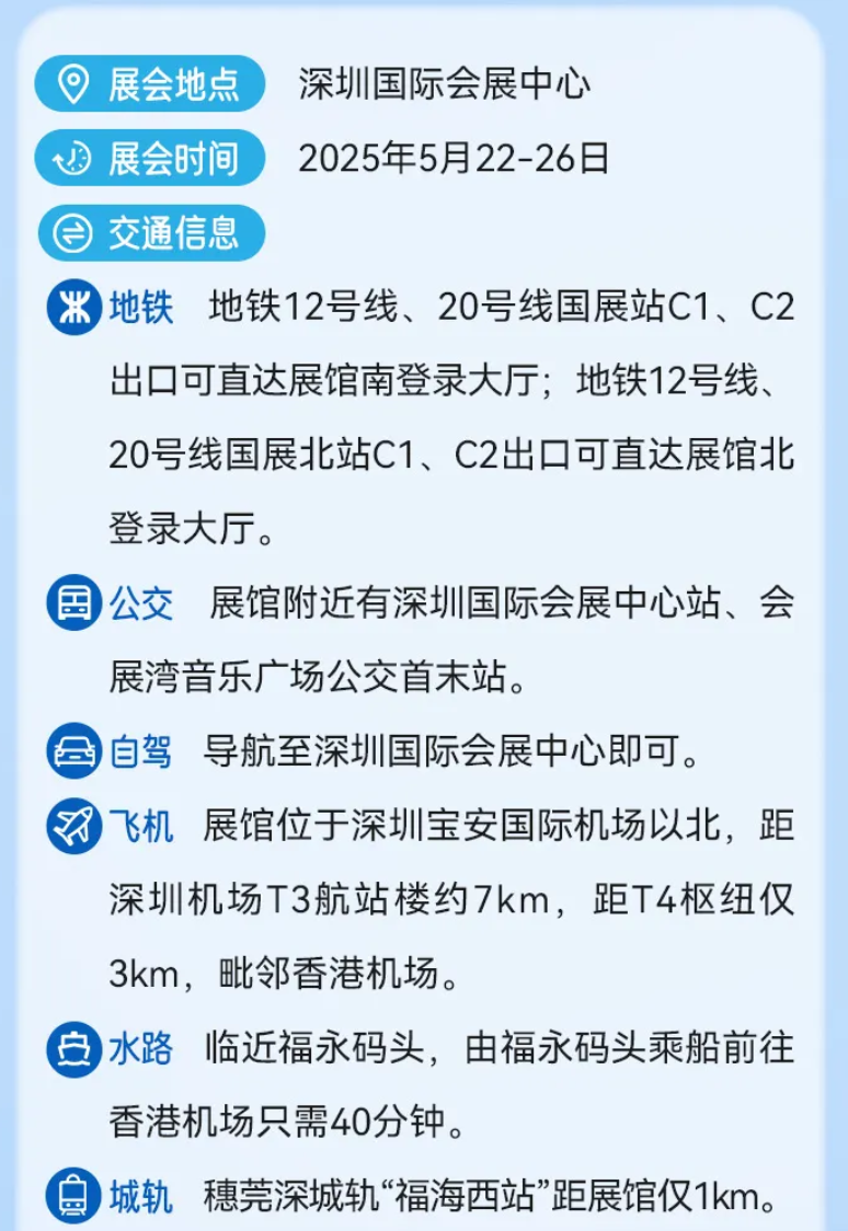 第二十一届文博会(主会场)将于2025年5月22日至26日(周四至周一)在深圳国际会展中心(深圳市宝安区展城路1号)9-16号馆举办,为期5天。