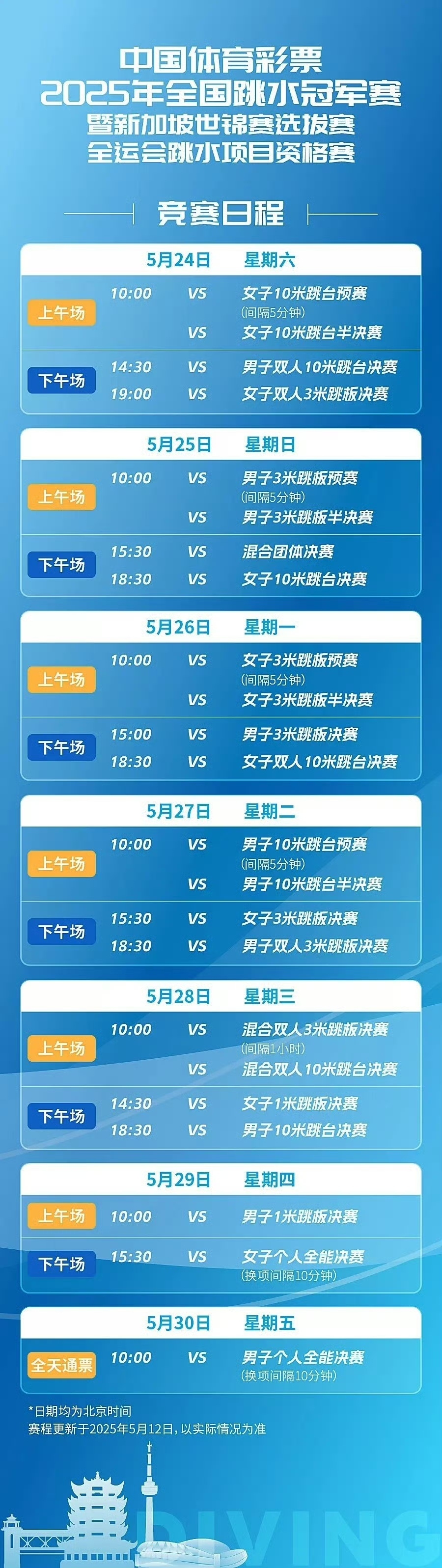 2025年全国跳水冠军赛将于5月24日至30日在武汉体育中心游泳馆激情上演,它是今年7月新加坡游泳世锦赛的选拔赛以及第十五届全国运动会跳水项目的资格赛,广东跳水队将在男子和女子跳台、跳板、个人全能、团体等17个项目中与全国各地的高手展开激烈的角逐,以饱满的热情与坚定的信念,向全运会决赛阶段资格发起冲击。