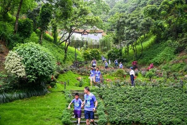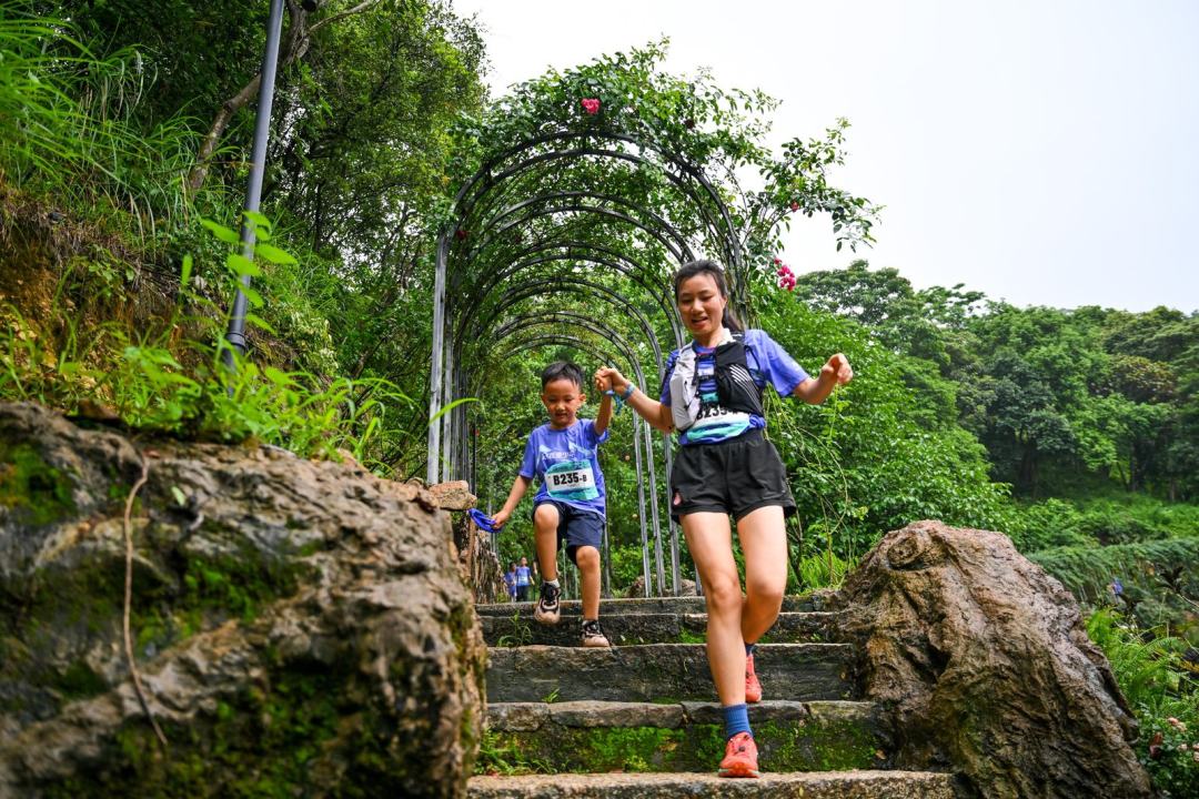 赛事分少年组与亲子组,根据年龄和性别共设12个组别,赛道设计平衡了竞技性与趣味性,全程6.5公里穿梭于广州天人山水大地艺术园的林间湖畔。少年组选手独自迎战陡坡与密林,用坚毅目光诠释“勇者无惧”。亲子组家庭则携手跨越障碍,父母与孩子的默契击掌、冲线时的相拥欢呼,成为十五运群众体育的生动缩影。