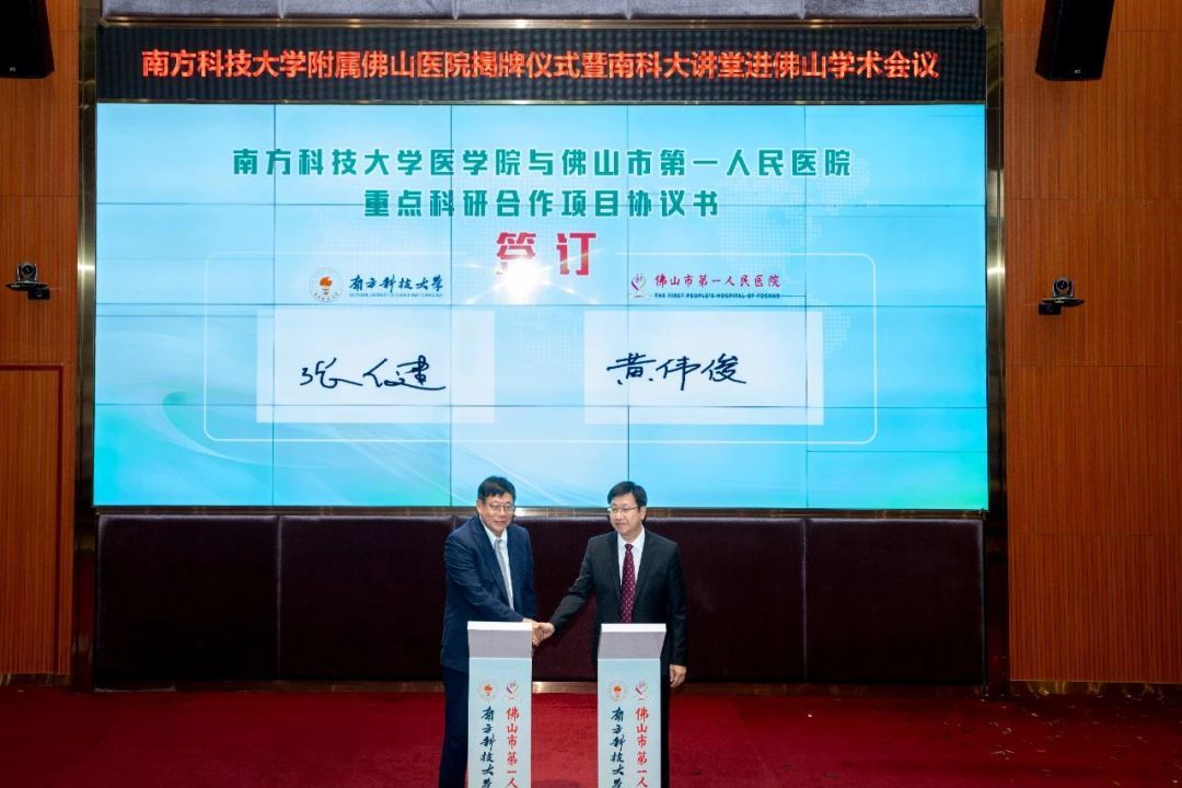 南方科技大学与佛山市第一人民医院共建附属佛山医院,是国内一流高校与地市龙头医院的强强联合,是深化医教研协同、推动卫生健康事业高质量发展的生动实践。通过合作共建,南方科技大学将为佛山市第一人民医院提供科研、教学、人才等资源,促进医院医教研协调发展,推动管理融合、品牌融合、人才融合、科研融合、教学融合,助力医院打造粤港澳大湾区一流、全国知名的高水平研究型医院。佛山市第一人民医院将为南方科技大学在医学人才培养、生命健康产业方面建立医疗、教育、科研、产业化(医工结合、医理结合、医学与生命健康结合)基地,拓展新医科发展平台,增强学校影响力和辐射力。