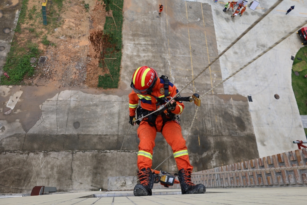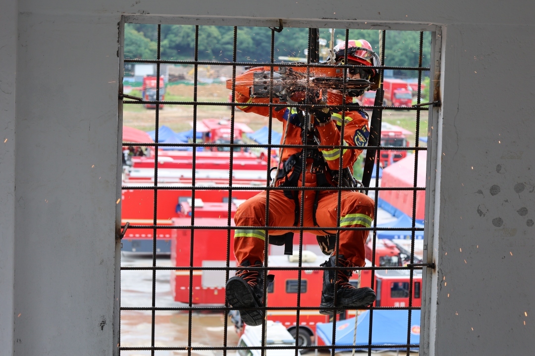参演队伍需徒步挺进“灾区”,完成2大灾害片区7大救援场景以及山体滑坡、建筑物倒塌、受限空间破拆、横渡绳索、高空救援等10个典型实战科目救援任务。在“建筑倒塌安全破拆救援”科目中,面对6层砖混楼房多层叠压式倒塌,队员综合运用多模雷达生命探测仪开展被困人员搜索定位,利用破拆顶撑技术打开营救通道,成功救出“被困人员”。