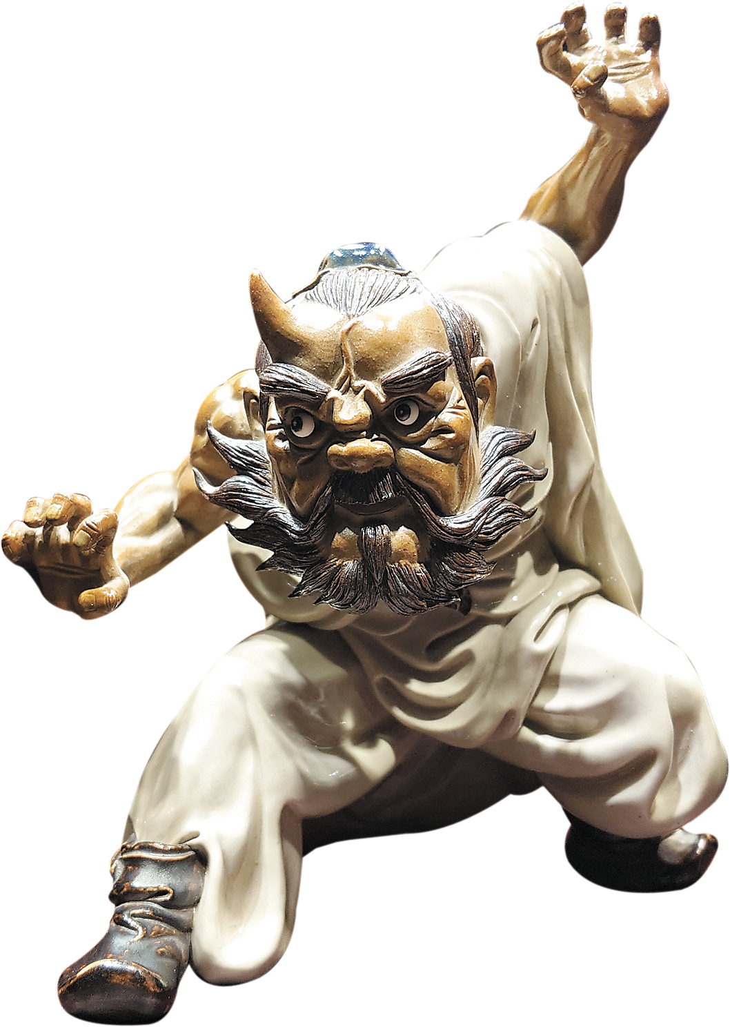 “风起石湾”展览中就有一个令人耳目一新的篇章——“金戈铁马——武士篇”。武士形象在传统石湾陶塑中并不多见,它真正作为一个成熟的题材系列引起人们关注,是从封伟民开始的。这些作品拓展了石湾陶艺的表现领域,在石湾陶塑界引发一股武士创作的潮流。“过去我们管石湾陶塑叫‘公仔’,就是说它体量小,可以拿在手中把玩。但现在随着城市空间尺度的变化,石湾陶塑的应用场景也应该改变,它完全可以作为家居装饰中的一个‘焦点’,和我们的生活连接起来”,封伟民说,“在创作手法上,也需要大胆创新。比如这组《五虎将》,我就用粗陶来做,粗陶原本是用来做花盆、水缸等的,但结合武将人物的身份,那种刚健、雄浑的气势反而表现得特别到位。”由此,“粗泥无釉”的潮流也一时风行起来。