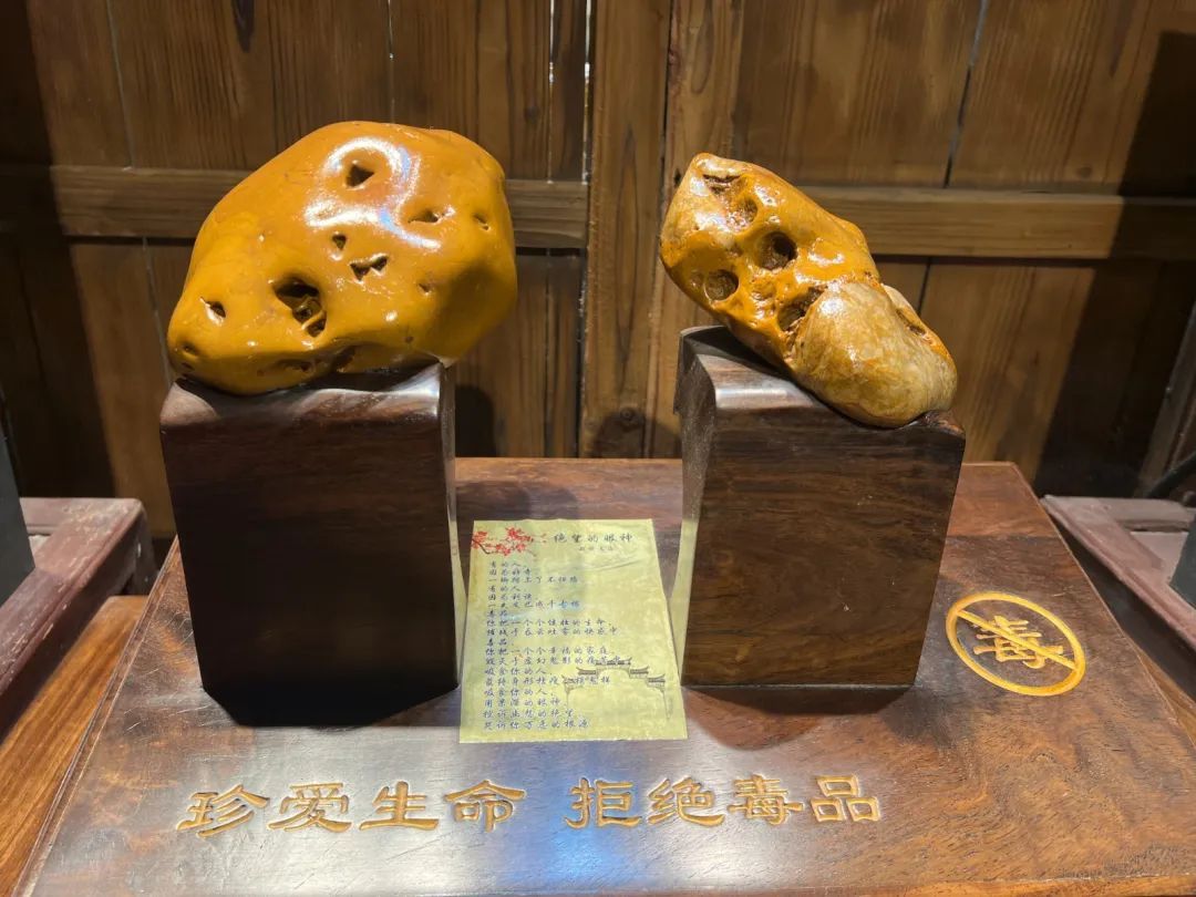 在万千奇石当中,有一个作品特别触目惊心。它以未经雕琢却以其鬼斧神工的纹理与轮廓,勾勒出“吸毒者”染上毒瘾后的外貌。这个作品名为“绝望的眼神”,由两块广西贺州的黄蜡石组成,以其神似“吸毒者”的形态警示世人珍爱生命,远离毒品。