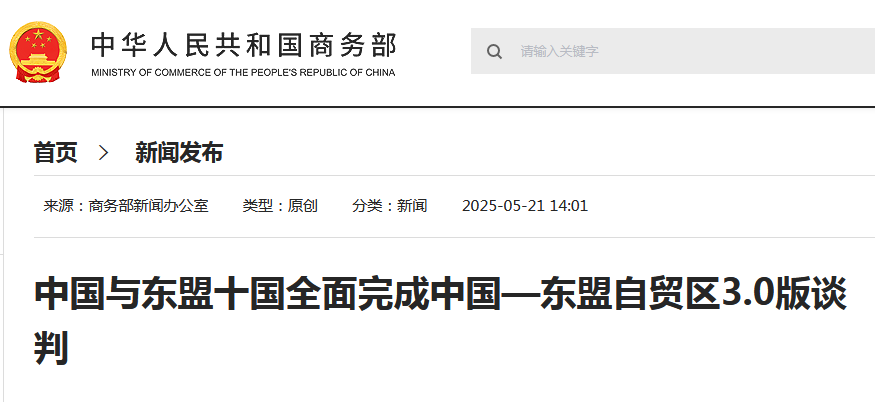 5月20日,中国—东盟经贸部长特别会议以线上方式举行,双方经贸部长共同宣布全面完成中国—东盟自贸区3.0版谈判。