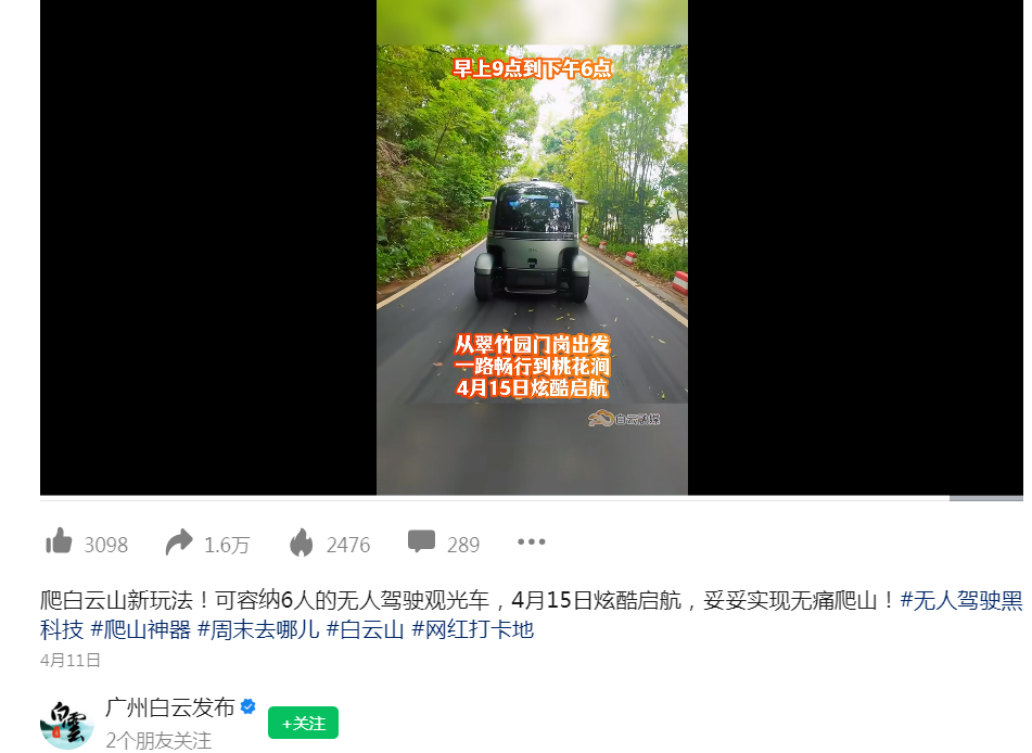 继摩星岭的落日云梯之后,广州“无痛爬山”2.0——白云山景区自4月15日起推出无人驾驶智能观光车,以创新科技重新定义山林之旅,备受关注。
