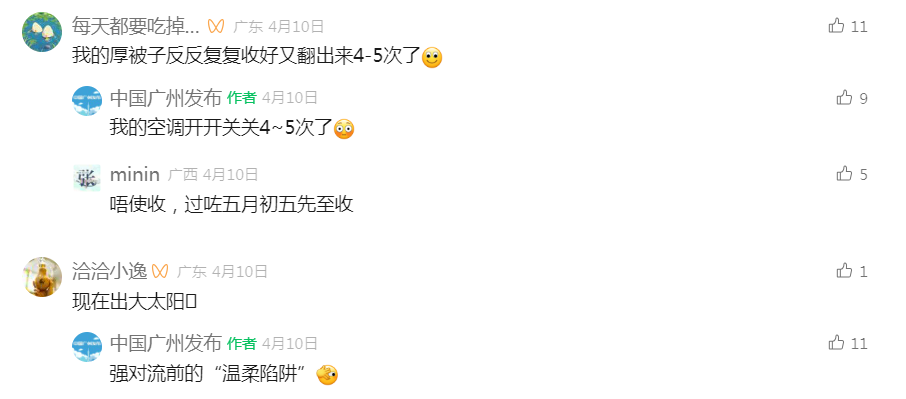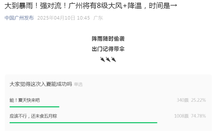 4月10日,“中国广州发布”微信号发布文章《大到暴雨!强对流!广州将有8级大风+降温,时间是→》,聚焦广州11日夜间至12日迎今年以来最大范围的强对流天气。一是及时发布天气变化信息,提醒市民注意防范。文章详细介绍广州10日雷雨“前奏”、11日白天强对流前的“温柔陷阱”、11日夜间-12日强对流正式登场等天气过程,建议市民注意天气变化,合理安排出行。该文章一经发布,阅读量迅速突破10万+,说明舆论对民生议题的高关注度。二是发布网络投票,吸引网民参与。文章最后设置“大家觉得这次入夏能成功吗”投票,累计有近1500人次参与。三是积极与网民互动,引导重视天气变化。以“《重生之我在广州当白切鸡》、不是有首歌叫《十二小时不下雨》吗”等极具幽默性、趣味性的语言特色与网民互动的同时,针对网民表示“现在出大太阳”的评论,回复“强对流前的‘温柔陷阱’”,进行舆论引导。四是市、区级政务新媒体联动,扩散应对措施。中国广州发布等市级政务新媒体,广州荔湾发布、广州海珠发布等区级政务新媒体,均于11日发布广州中考体育因强对流天气于12日停考一天的信息,提升应对措施的传播覆盖面和精准度。