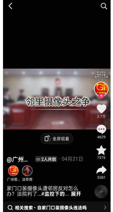 4月21日,“广州普法”抖音号发布视频《家门口装摄像头遭邻居反对怎么办?法院判了...》,关注一起因安装摄像头引发的邻里纠纷。一是以案释法,普及隐私权、财产权的权益序位和平衡。该视频中,原告认为被告安装摄像头侵犯其隐私权,被告则认为安装摄像头是为了保护个人财产安全。法官审判认为,一般来说,人格权益优于财产权益,被告安装摄像头是否侵犯了原告的隐私权,应进行综合判断。根据本案中摄像头摄录范围为“特定的两户家庭”,以及现场调查“摄像头可以完整监控摄录原告家庭隐私信息”等情况,监控摄像头应予以拆除。二是网民参与讨论“安装摄像头是否侵权”热情高涨,合理限度范围内安装使用摄像头成共识。目前,该视频累计已有2.7万点赞,评论、转发数均达5千左右。网民围绕如何合理安装使用摄像头展开讨论。如“虽然是公共区域,但也是该层所有住户的公共区域,必须征得所有住户同意才能安装”“监控安在门顶45度角向下,刚好能看到自己家门口一米范围,还不照到别人家门口”。