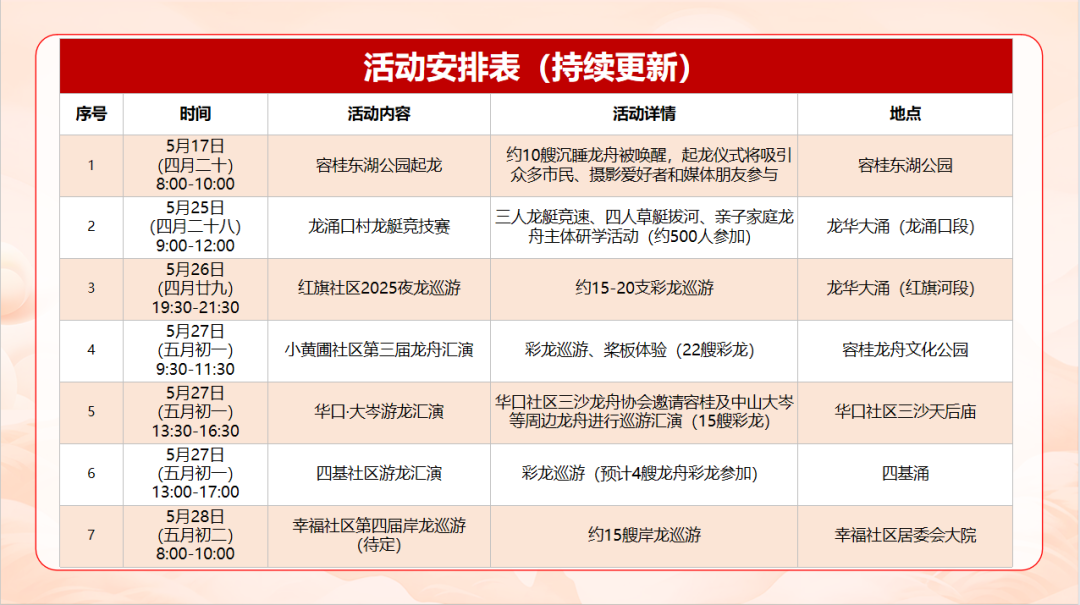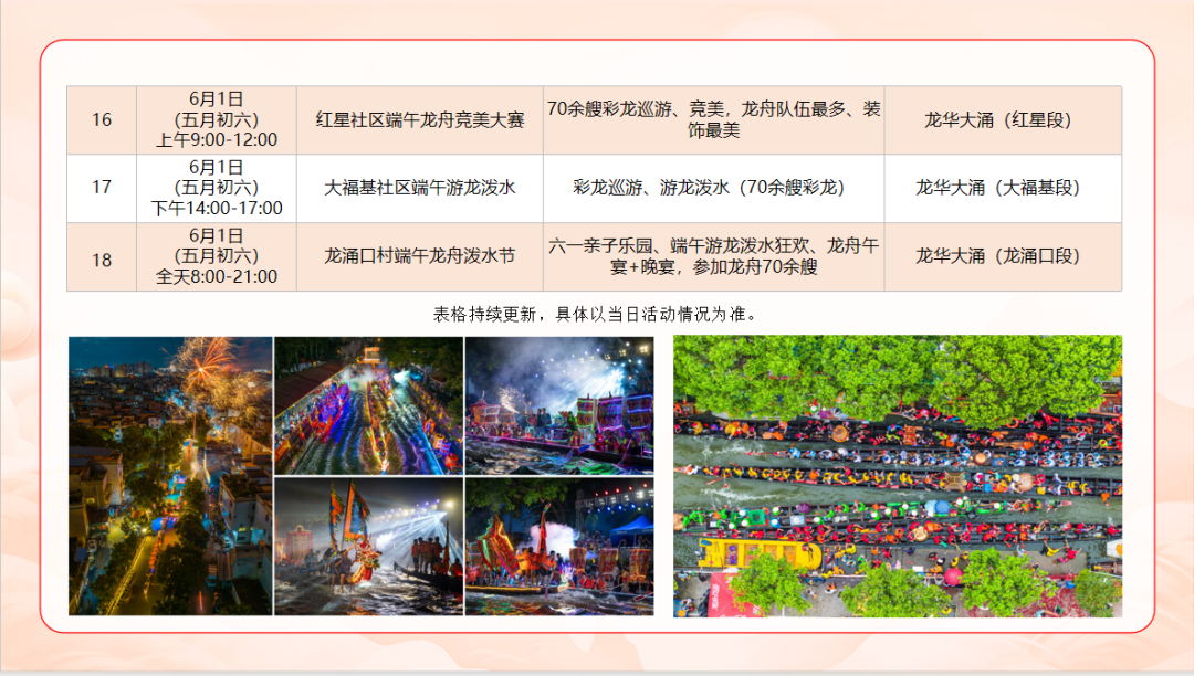 彩龙巡游、龙舟饭、水上集市、水上嘉年华……