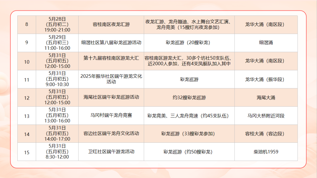 地点:龙华大涌(龙涌口河段)、容桂龙涌口村委会龙艇竞技杯、亲子游园嘉年华、泼水狂欢节……岸上岸下互动乐趣满满!