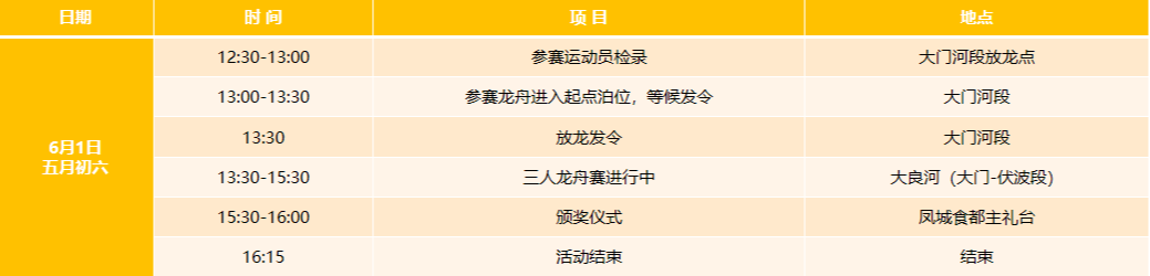 地点:逢简村内逢简村传统龙舟竞速赛计时赛以社(组)为单位,每条龙舟限28人。每条龙舟共赛两轮,取用时较小为最终成绩。南朗村五月十三关帝诞“三人莲艇赛”活动