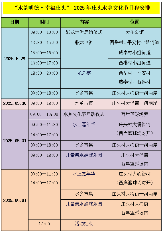 地点:大岳公馆庄头村、聚龙村、上海村三龙继续聚首在庄头村,开展彩龙巡游,延续情谊、欢度端午~此次巡游途经西岳村、平安村、成泰村、西淋村各小组河道,快来助威呐喊吧~龙舟宴