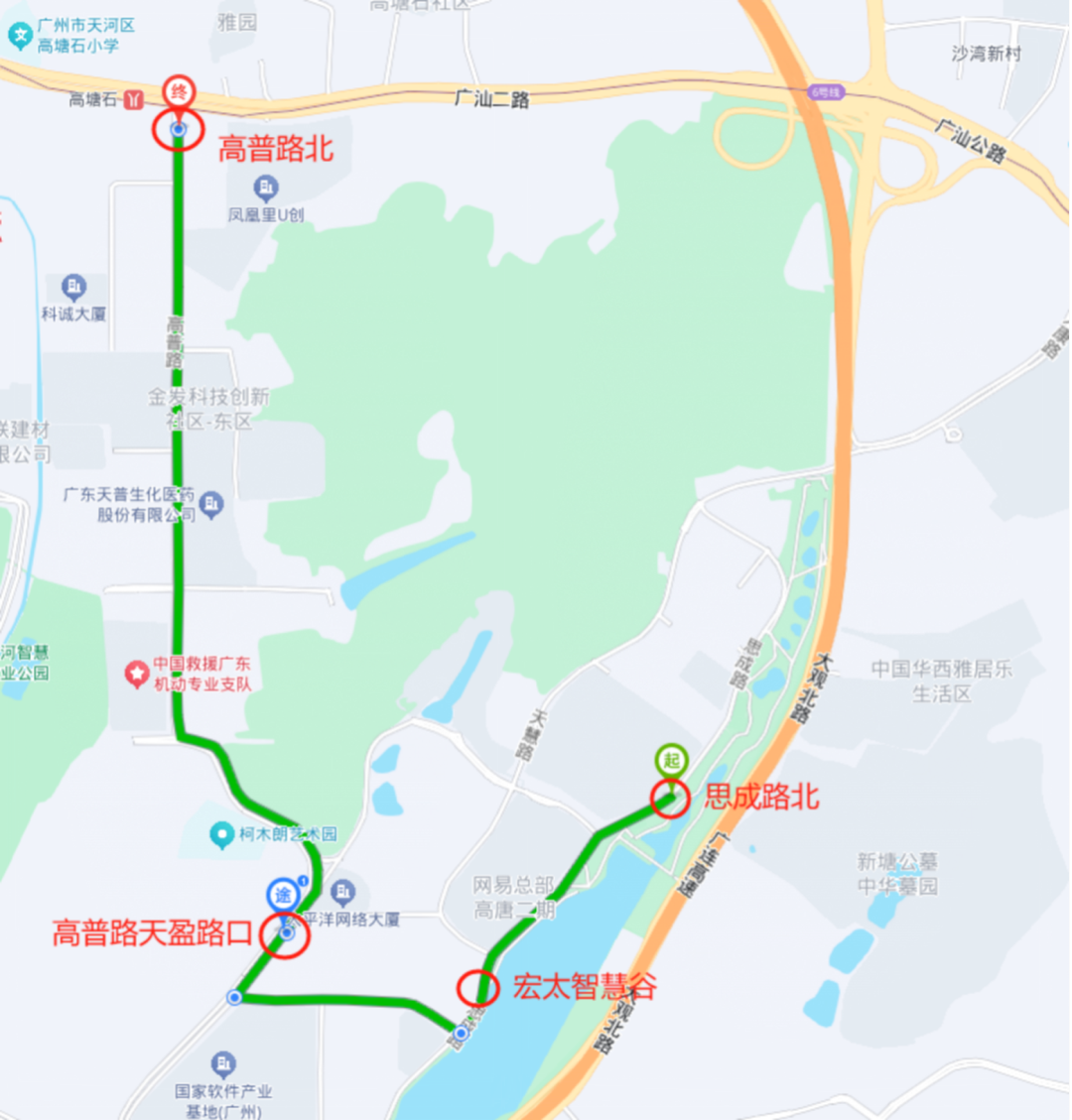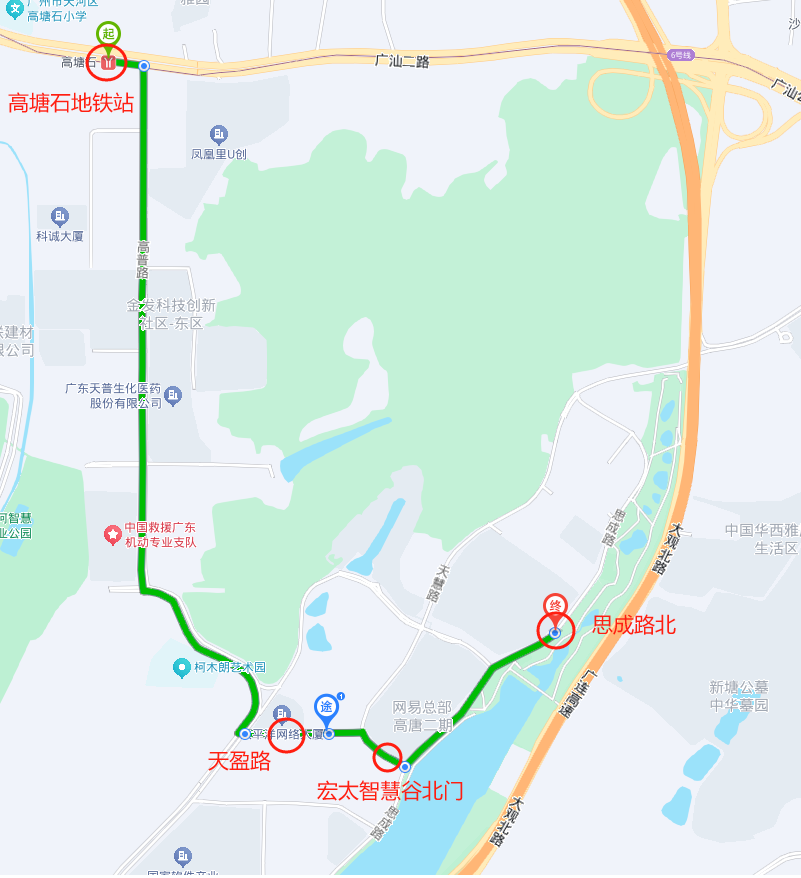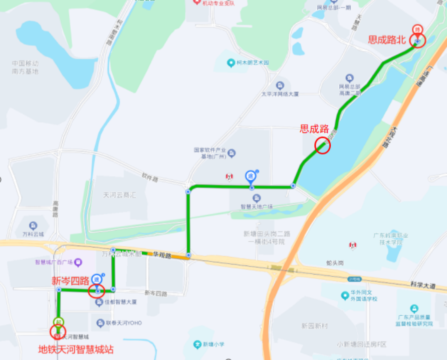 经停站点:地铁天河智慧城站—新岑四路站—思成路站—思成路北站