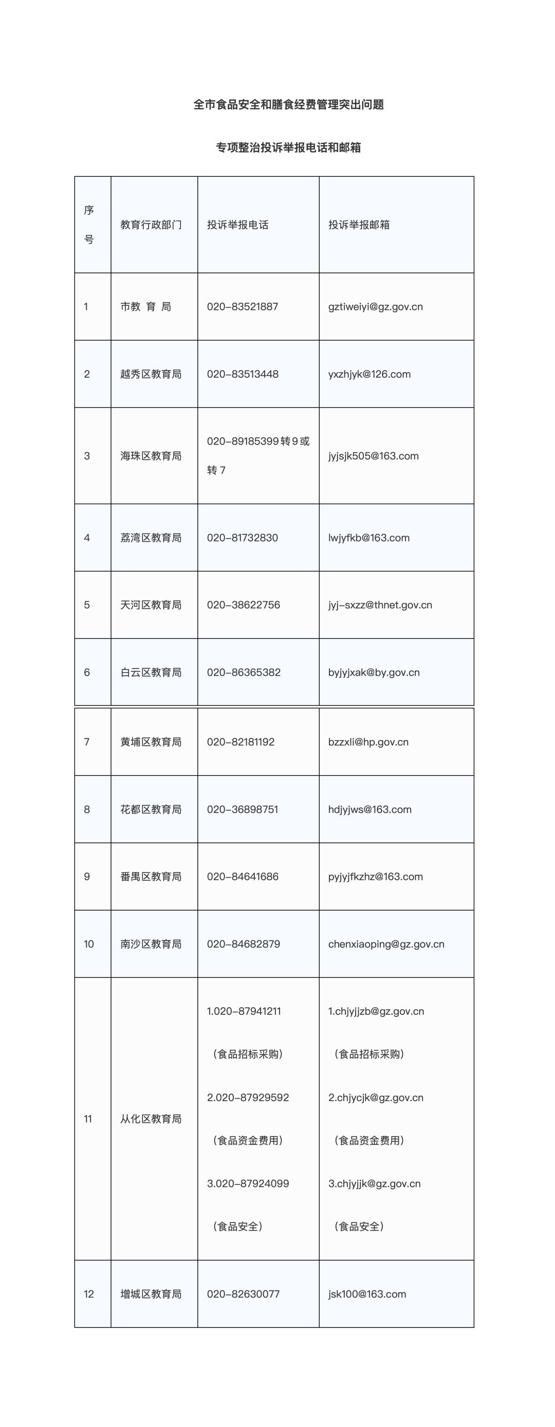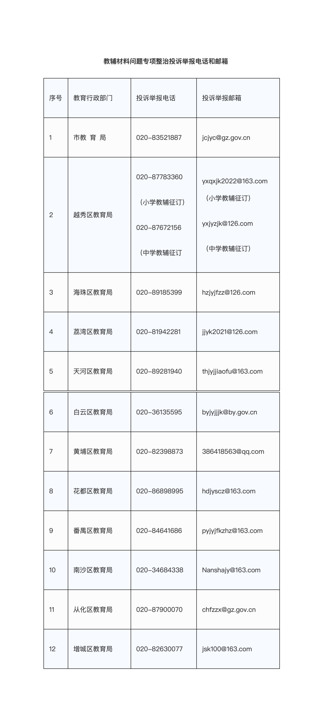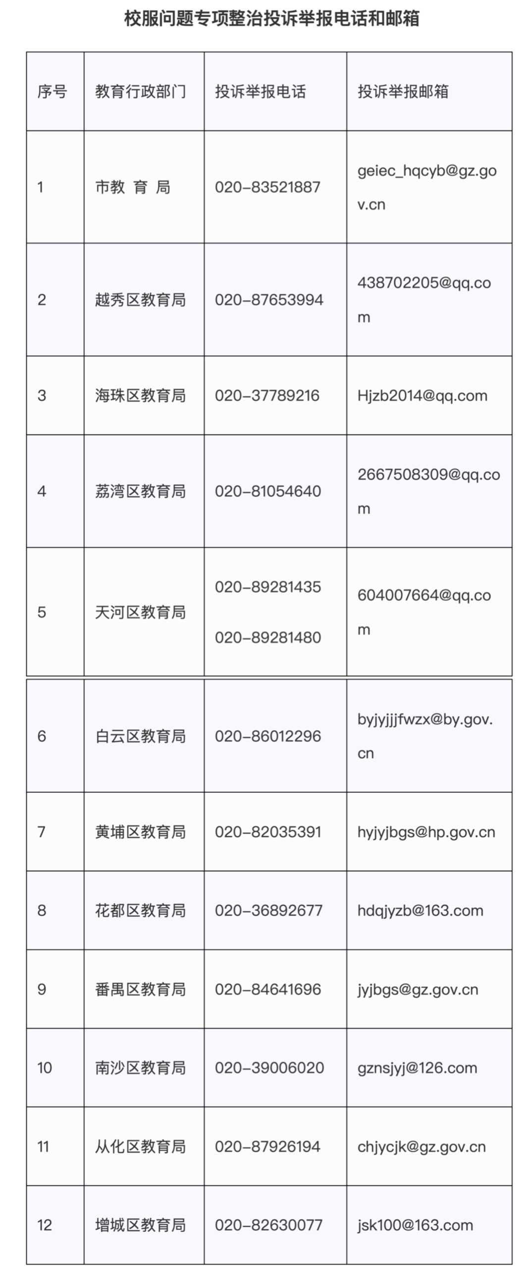 据悉,广州市教育局持续深化“校园餐”专项整治,深入纠治群众反映突出的利用教辅征订、校服采购谋利等方面的问题。为进一步畅通广大师生、家长、社会公众投诉举报渠道,建立家校社协同监督机制,广州市教育局公布了市、区教育行政部门设立的投诉举报电话和邮箱,受理相关投诉举报。
