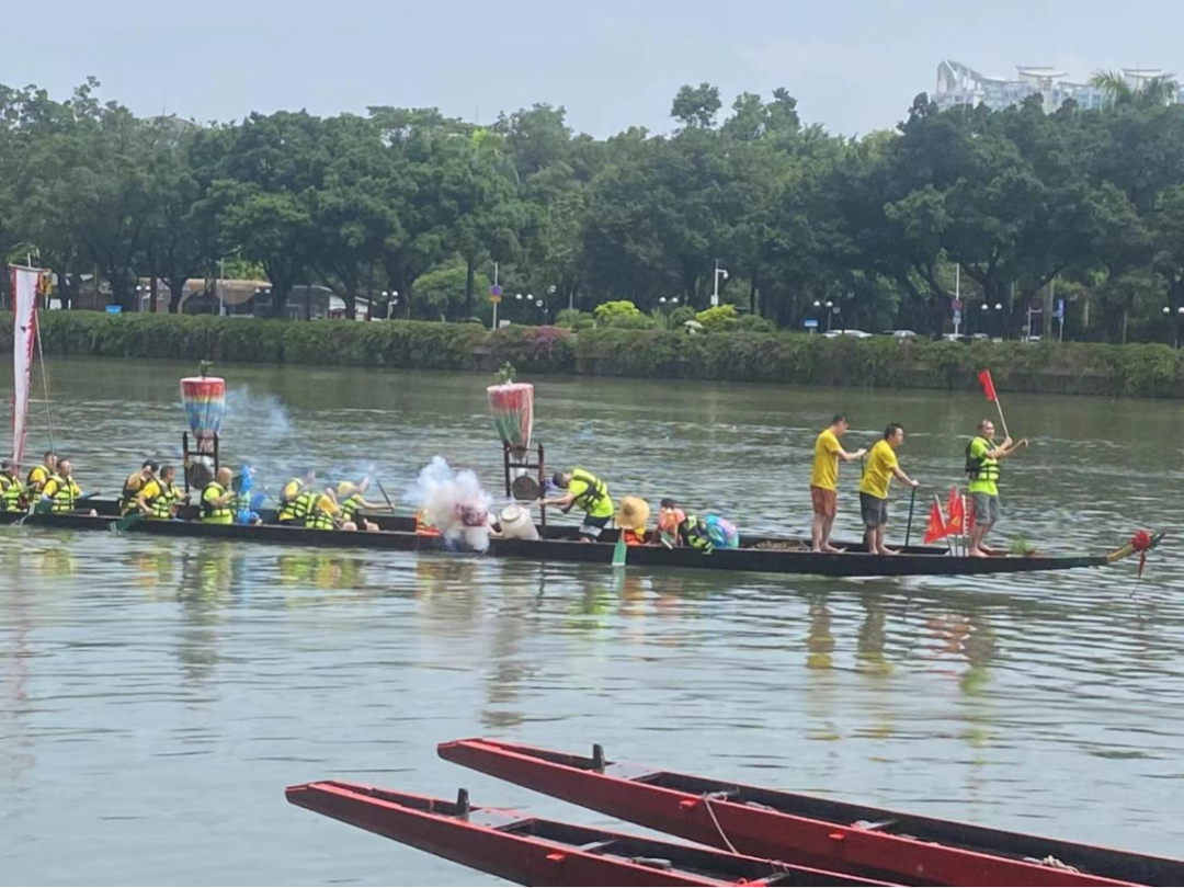 随着一连串的鞭炮声响起,“沉睡”的龙舟被彻底“唤醒”。村民们有的扒船,有的打鼓,整艘龙舟在水道上来回巡游,划出一道道波浪。恰逢寺右龙舟在同一时间段进行“采青”仪式,几首龙舟同时出现在江面上,场面十分壮观,吸引了众多街坊观赏。