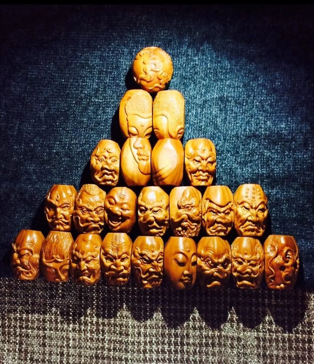 勇于探索、敢于创新的精神在彭德平身上体现得淋漓尽致。在核雕创作上,他擅长打破常规,敏锐察觉传统核雕存在的局限性。2016年,彭德平对核雕进行艺术革新,创作出“方圆”十八罗汉系列作品,突破传统核雕追求圆和大尺寸的模式,将核雕转化为立体构成艺术,以独特结构和夸张刀工形成强烈的个人符号。