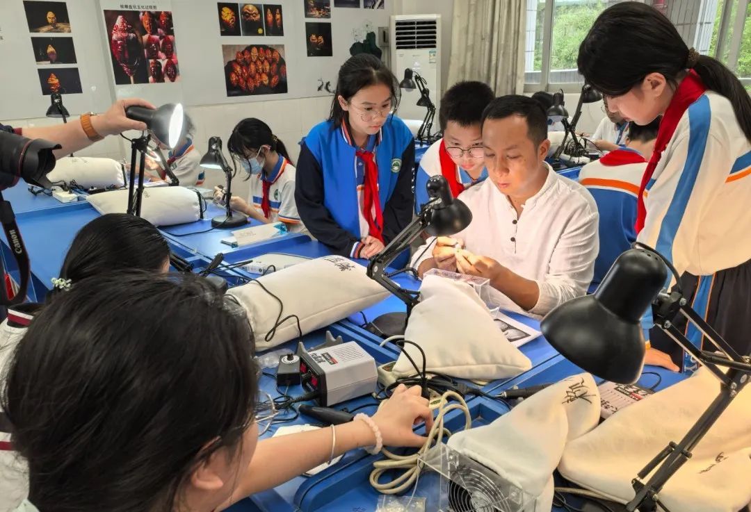 从驻村开始,彭德平就十分重视核雕技艺的传承,他采用“长期带教+实践变现”模式,培养核雕爱好者,覆盖小学生、中年人等,目前学员已超200人。其学生作品从几百元的亲民价位到上万元的收藏级,覆盖不同市场需求,部分学生靠技艺实现了非遗技艺的社会效益与经济效益双丰收,为非遗传承探索出可持续发展路径。